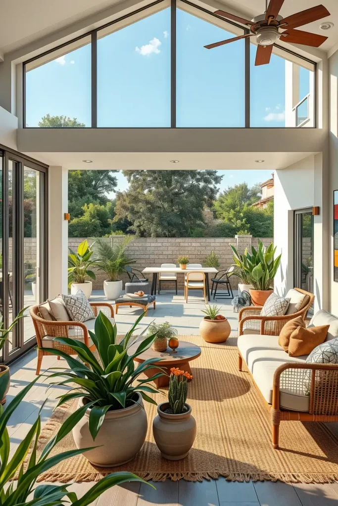 I tend to recommend furniture that would match both in and outdoors decors. To illustrate, a sofa that has been upholstered using long-lasting, weather-resistant fabrics look excellent when accompanied with patio chairs of the same style. This continuity is further enhanced by the use of planters, woven rugs and natural stone surfaces.