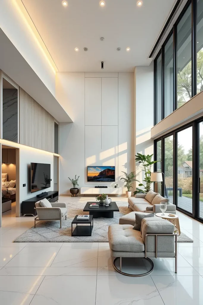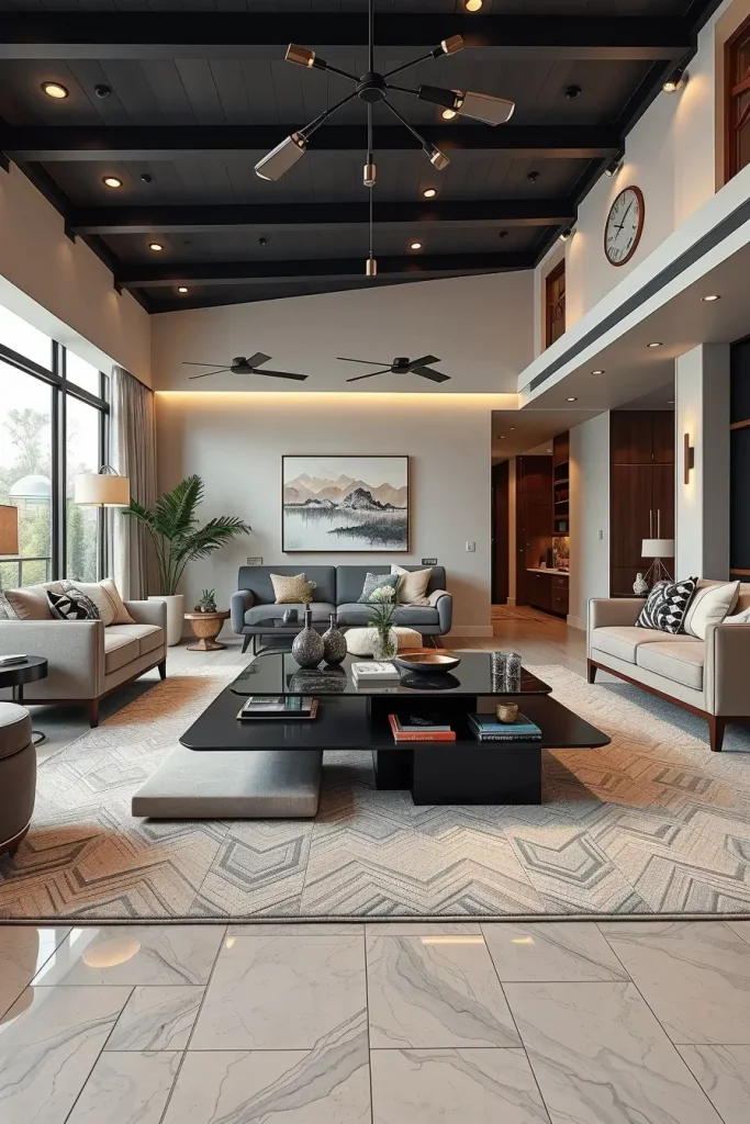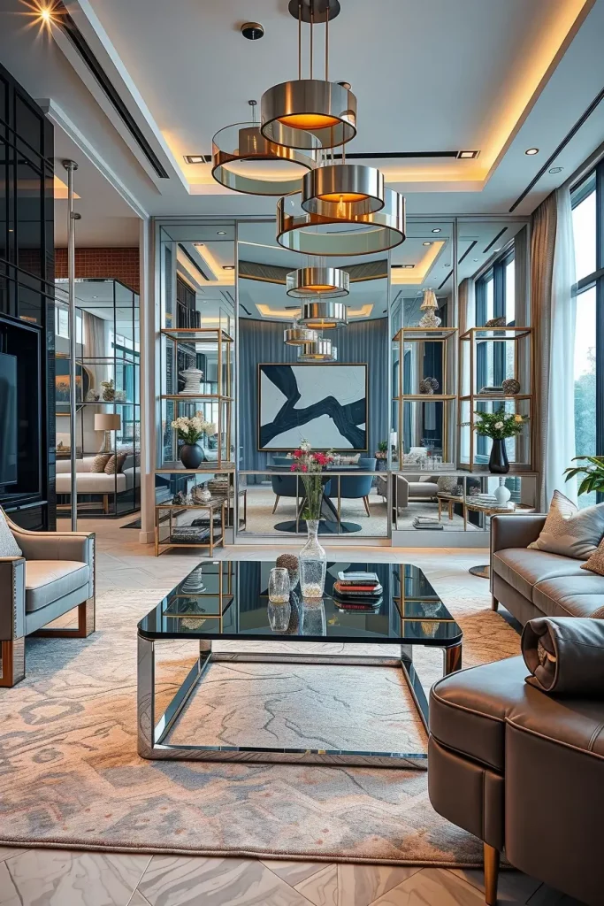 In terms of smooth modern interior designs, glass and metal details are the order of the day in 2026. The mirrored floor, glass tables, and metallic surfaces used in finishing it all reflect light which makes the room look bigger and more dynamic.