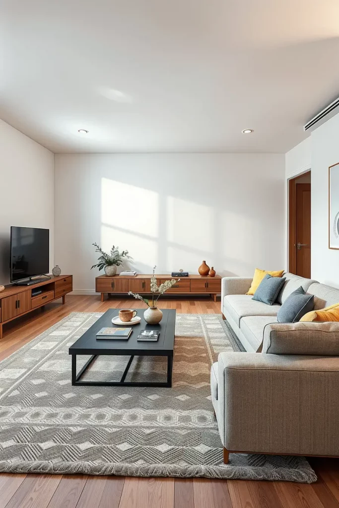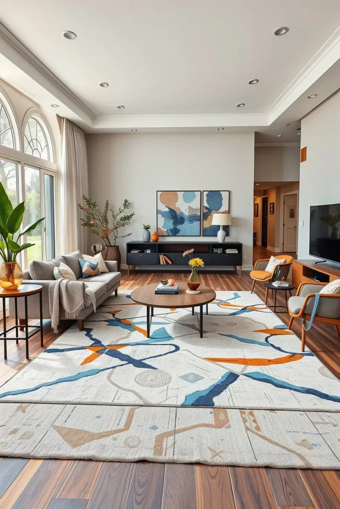 In my case, one of the most useful means to anchor a living room is a statement rug. Rugs are used to delimit areas, as well as add color and in-room warmth to open plans in the modern interior. Geometric patterns and abstract designs of all sizes are also on trend in 2026, in most cases in strong colours that contrast with minimalist walls and floors.