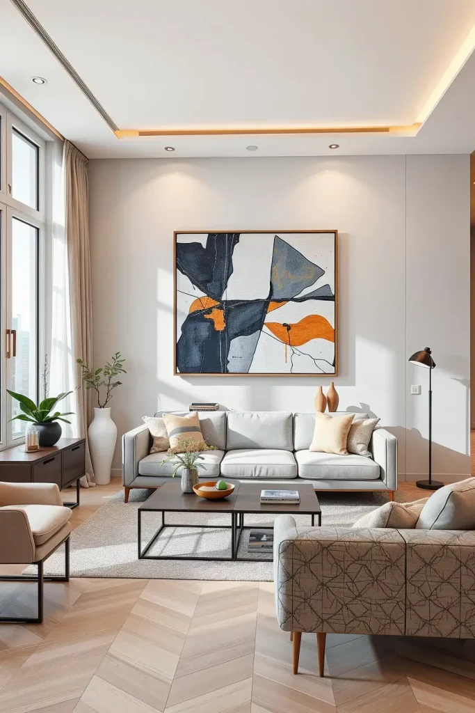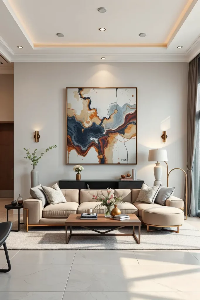 There is not a single modern living room without artwork. I also would always stress the need to incorporate a piece of contemporary artwork that would serve as a conversation, and a representation of the style of the homeowner. The focal wall is being characterized in 2026 by the use of oversized canvases, digital art frames and abstract sculptures.