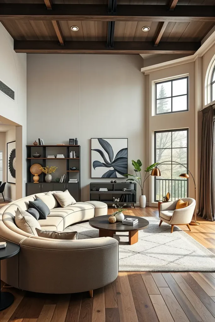 Curved furniture is another trend emerging in the modern-day living room concepts in 2026. Straight lines were used over the years but currently, curved lines and organic shapes are gaining prominence in the interior. Arched chairs, curved sofas and circular tables soften the area and introduce a friendly touch.