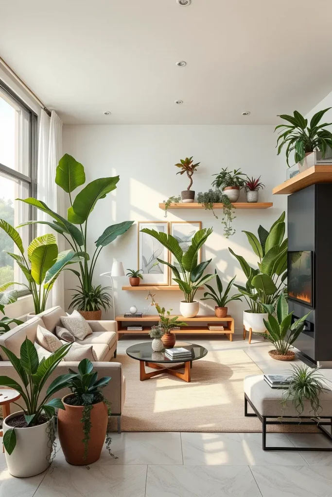I would recommend tall plants like fiddle leaf figs or palms in the corner, smaller succulents within the shelves and cascading plants on the floating units. These vegetation cushion the straight lines of the modern furniture and bring organic beauty to interior design.