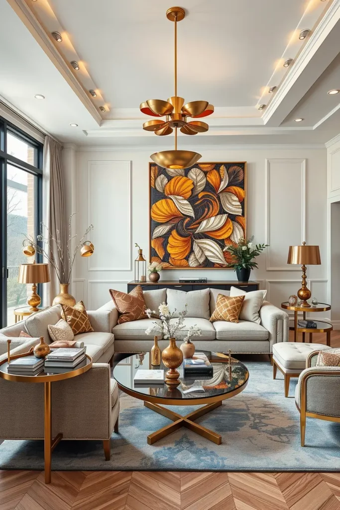 In the context of modern living room design, metallic finish can create an extraordinary effect on the atmosphere of a room. Metallic accents, whether brushed gold, matte black, or polished chrome, are a cool accessory that adds depth to a neutral color scheme as well as a striking one.