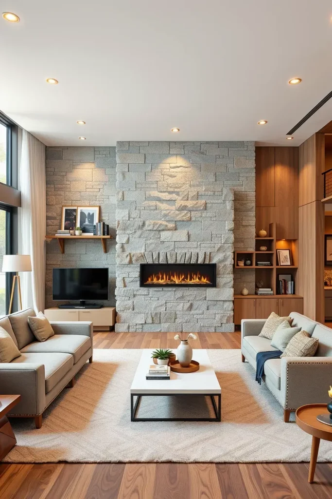 In designing such a space, I usually center my efforts in matching the fireplace with contemporary furniture like low-profile sofas, modular shelves and minimalist coffee tables. The use of a small amount of LED accent lights along the fireplace produces a dramatic effect and the glass or metal details provide the whole arrangement with a sophisticated feeling. Such a harmony of fire and form generates a comfortable but elegant appearance.