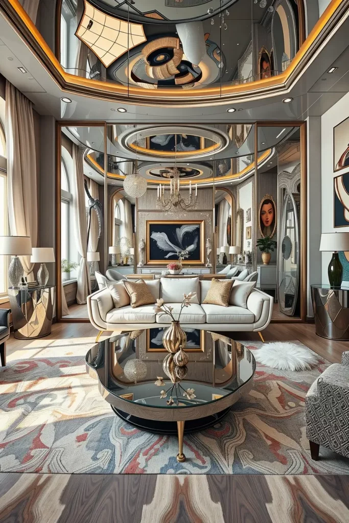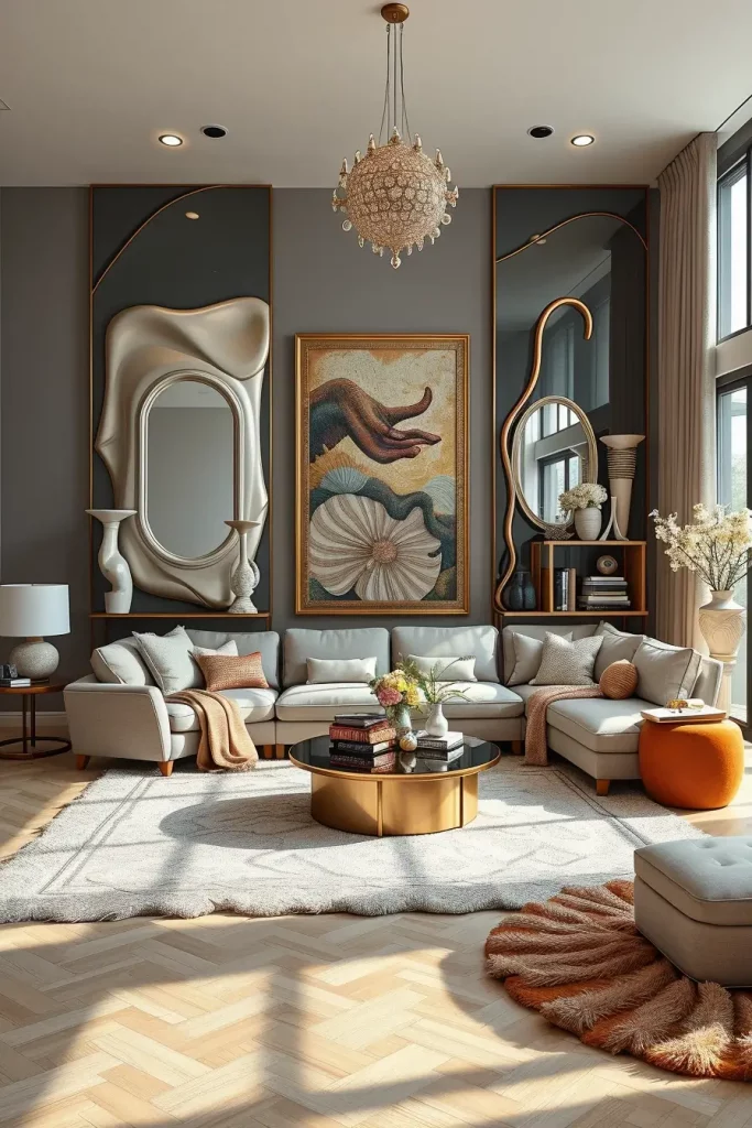 Mirrors are an interesting feature in modern interior design, but in the surrealist design, they serve a completely different purpose. I prefer to use distorted mirrors, wavy frames, unusual shapes or fragmented designs which reflect in an otherworldly way. These illusions make the living room appear larger and with a surrealistic flavor.