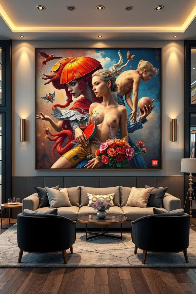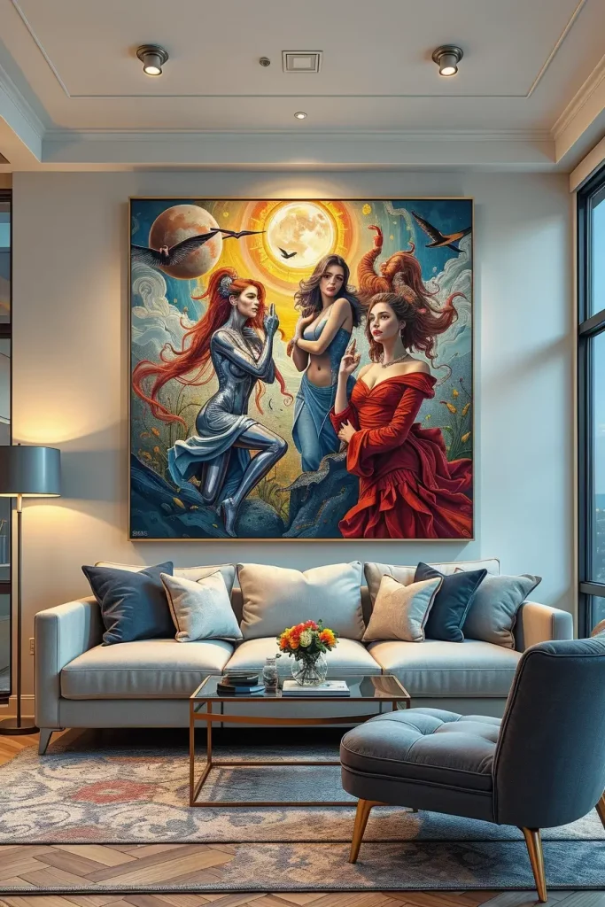 In my case, wall art is one of the most affordable methods of adding surrealism to a contemporary living room. Abstract works of art such as paintings, prints, or digital art installations are powerful focal points that are dreamlike in nature. They turn blank walls into surfaces that express the surrealist spirit.
