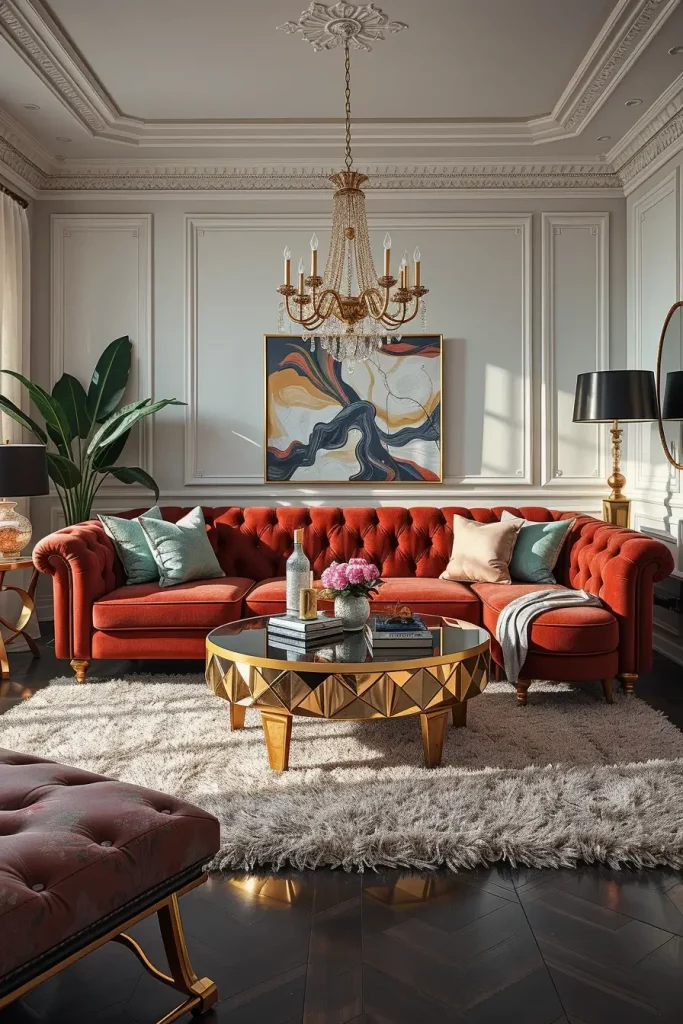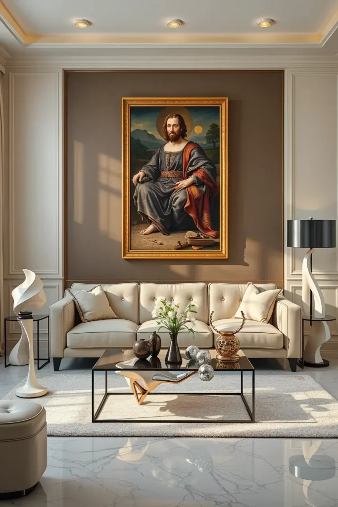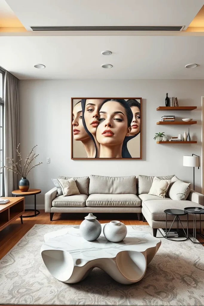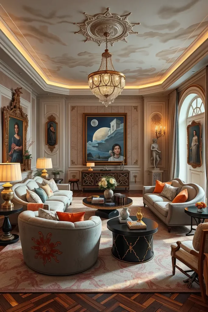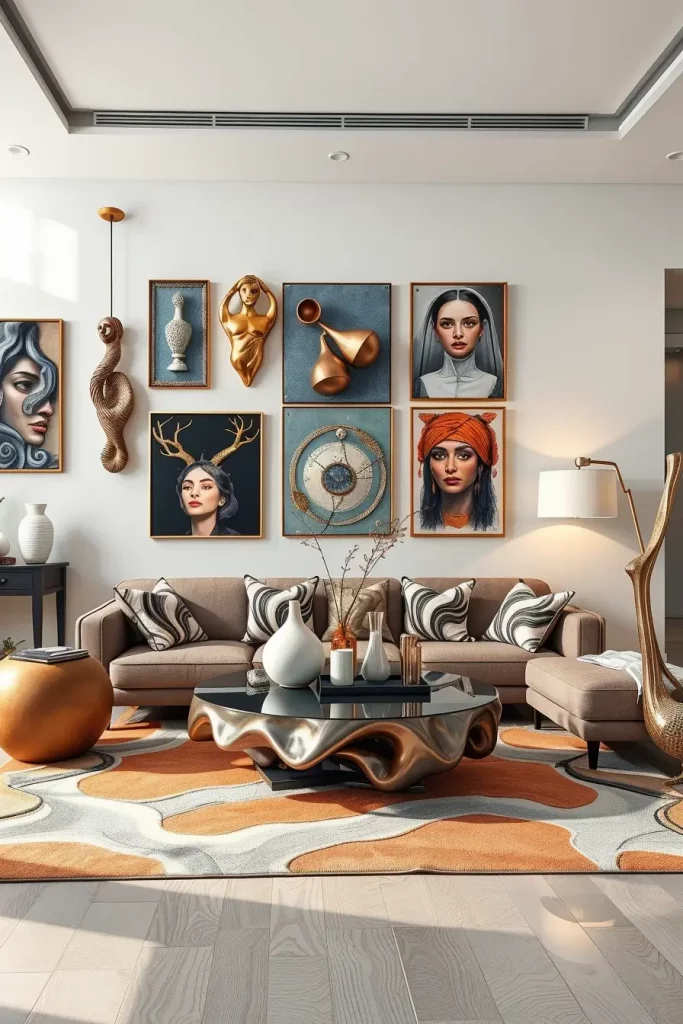 What I would add to this is the use of mirrored surfaces or glossy finishes to enhance the contrast. Reflective coffee tables or mirrored consoles can serve as the links between traditional frames and surrealistic furniture, so that the room will preserve its modernistic character and at the same time will be able to explore the artistic extremes.