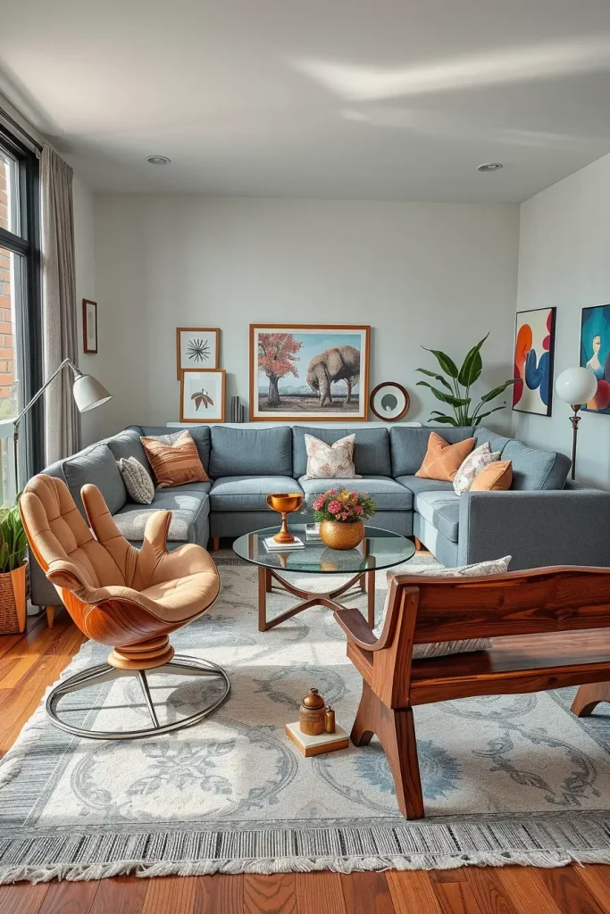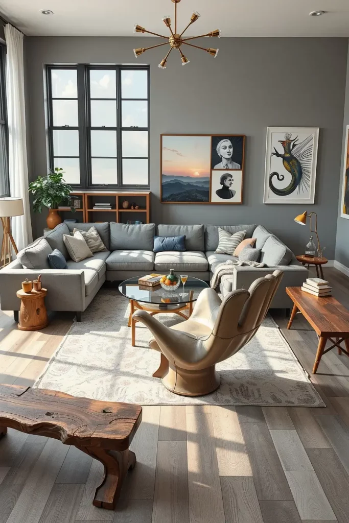My approach to designing this way is to select a powerful anchor piece, which is usually a sofa, and then add surprising partners. As an example, a modern gray sectional can be placed next to a playful chair in the shape of a hand or a side table with uneven legs. These combinations render the living room to have a curated gallery instead of a typical arrangement.