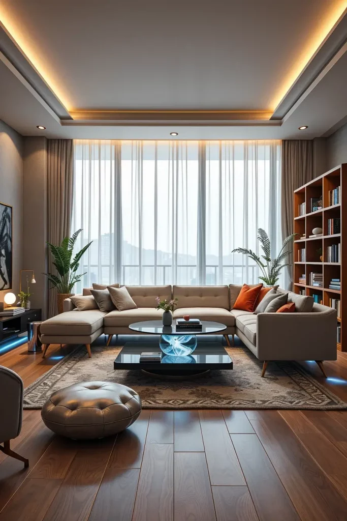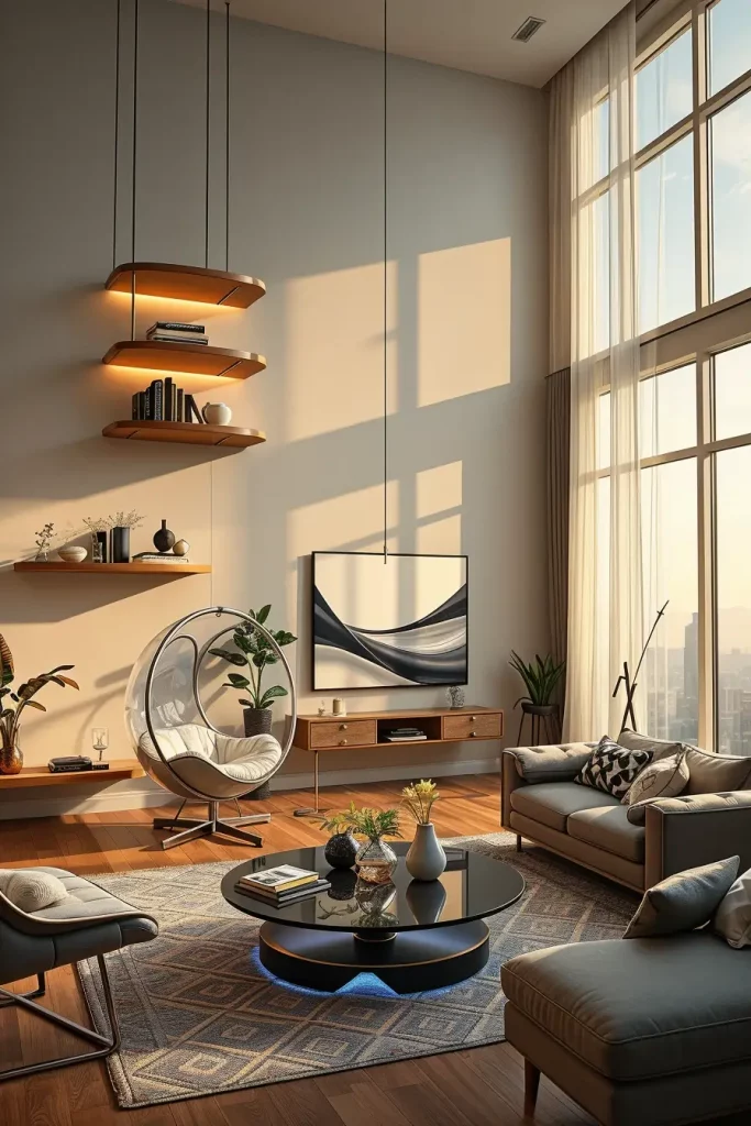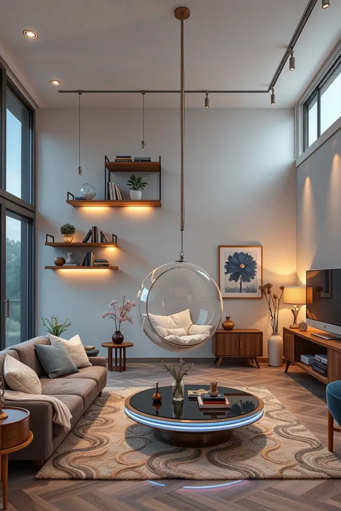I would include wall-mounted seats, floating-type coffee tables with invisible bases or bookshelves that seem to lean at unnatural angles. These components do not only add visual appeal, but also demonstrate recent engineering and design tricks.