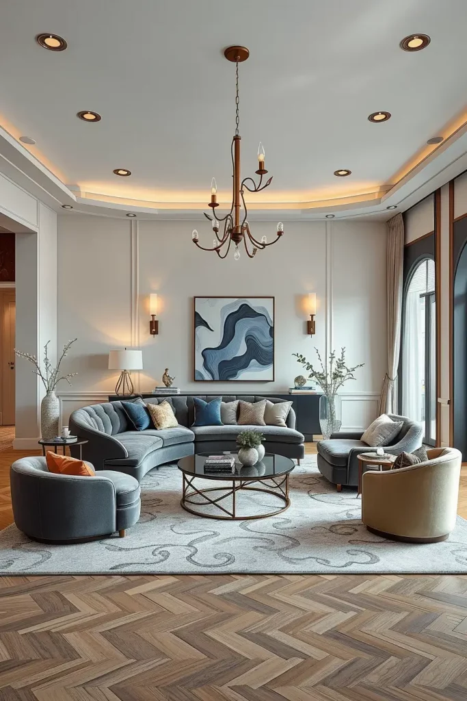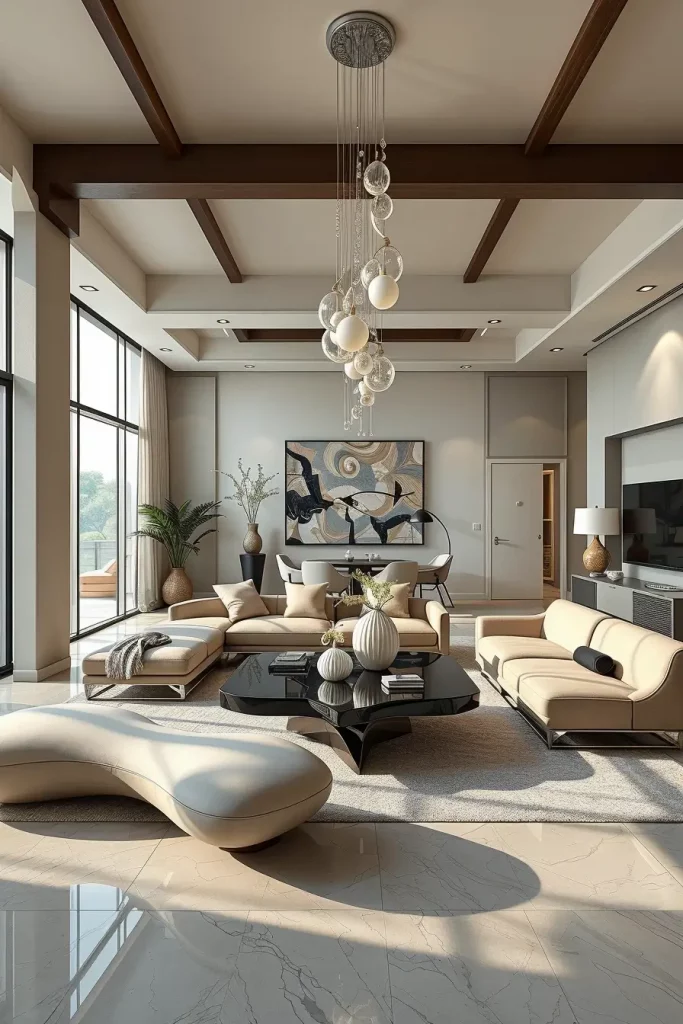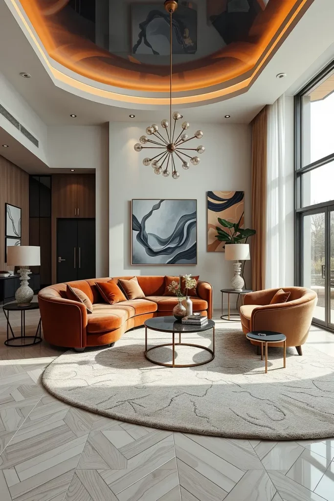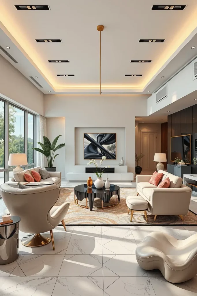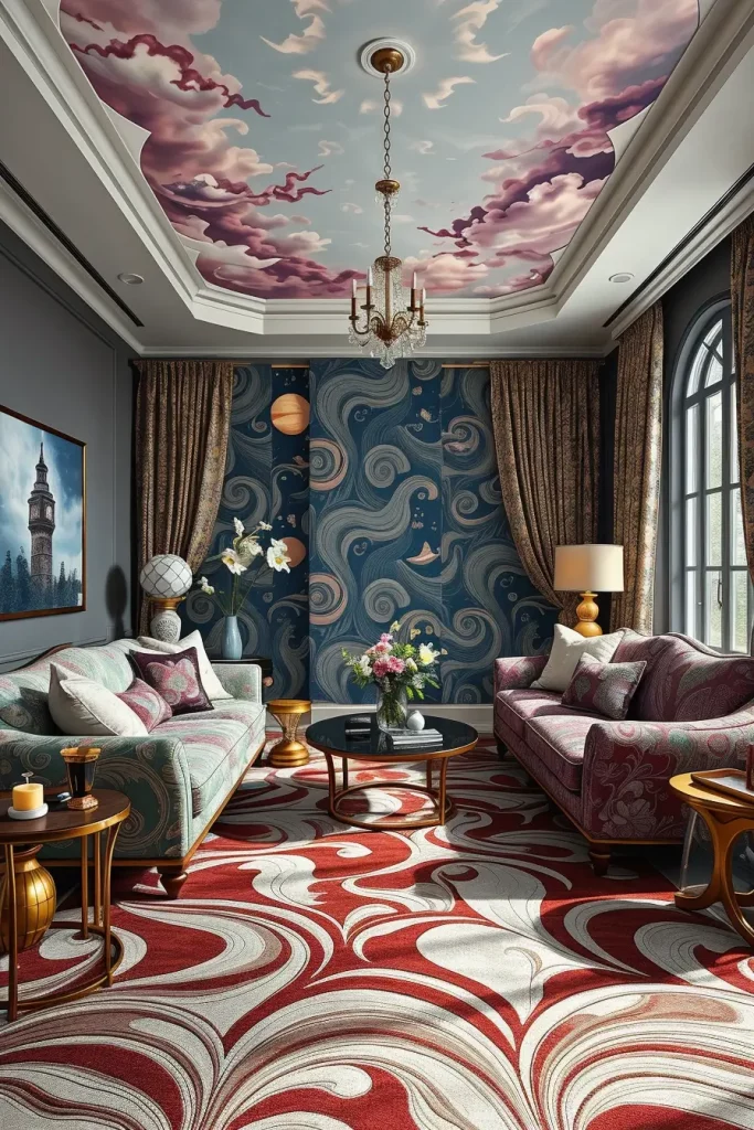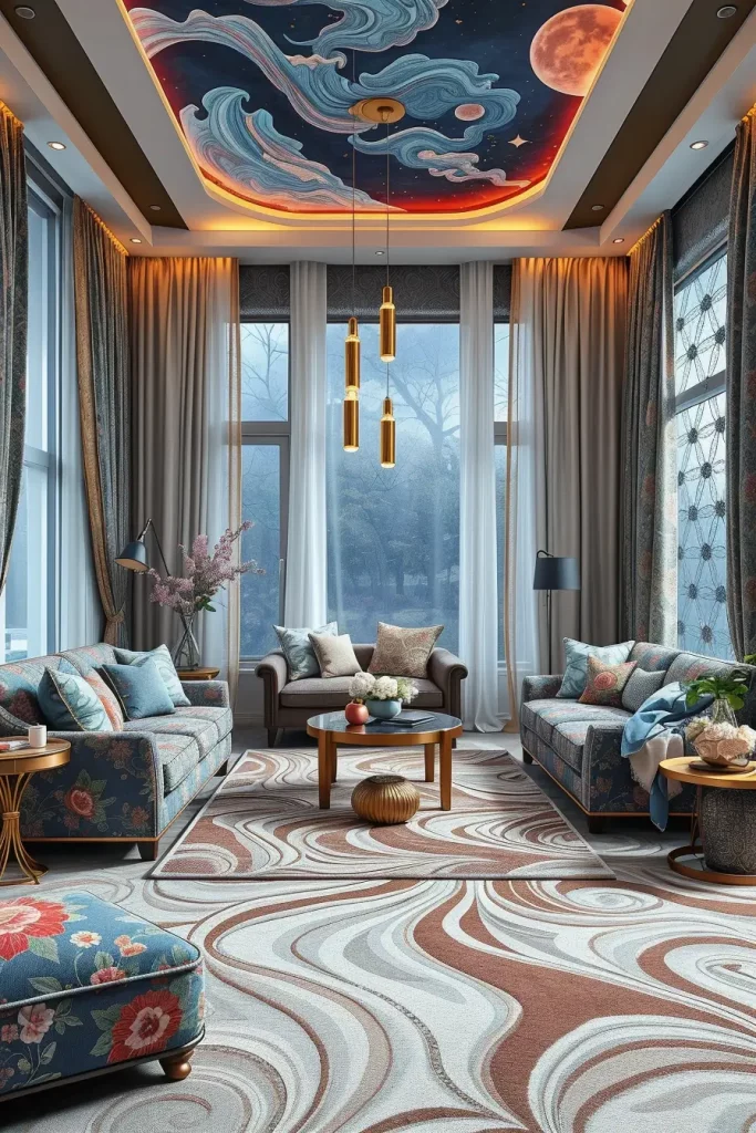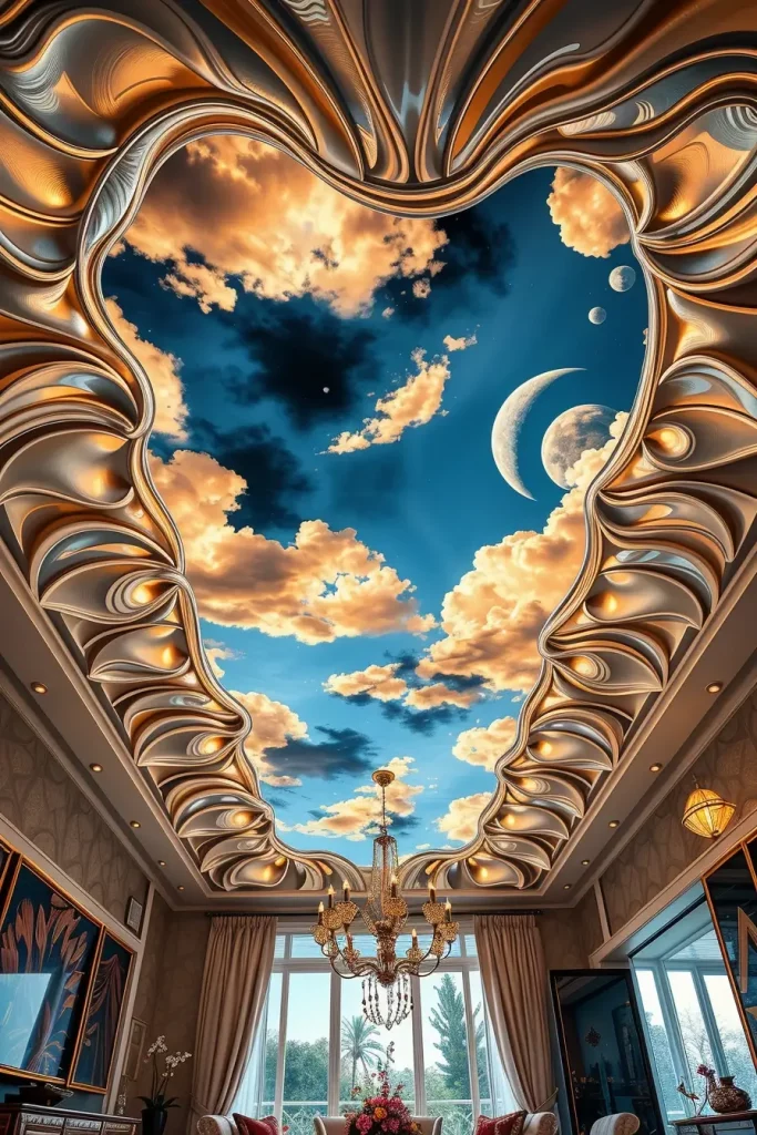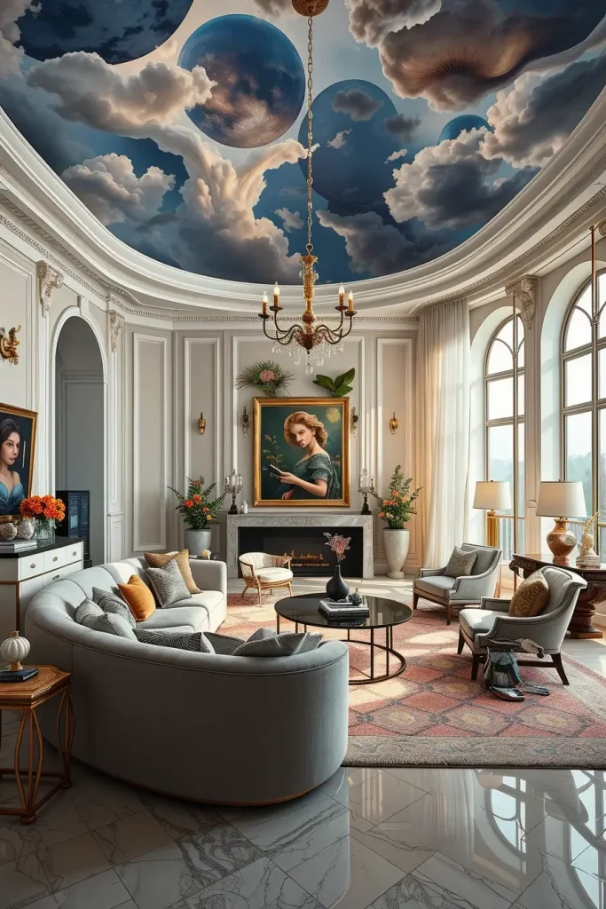 The ceiling is sometimes referred to as the fifth wall, and in surrealist interiors, it is a place of imagination. Another modern living room can be changed with the help of the unusual ceiling treatment like 3D panels, painted illusion or reflective material. These details cause guests to look up, giving another level to the surrealist story.