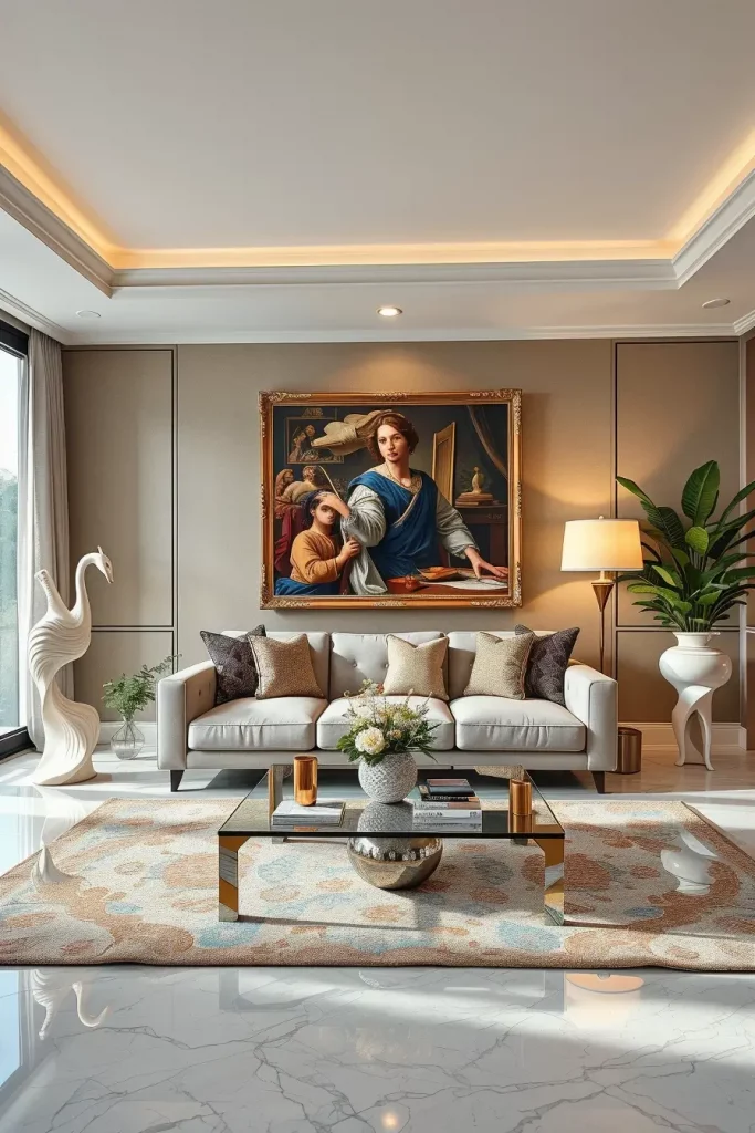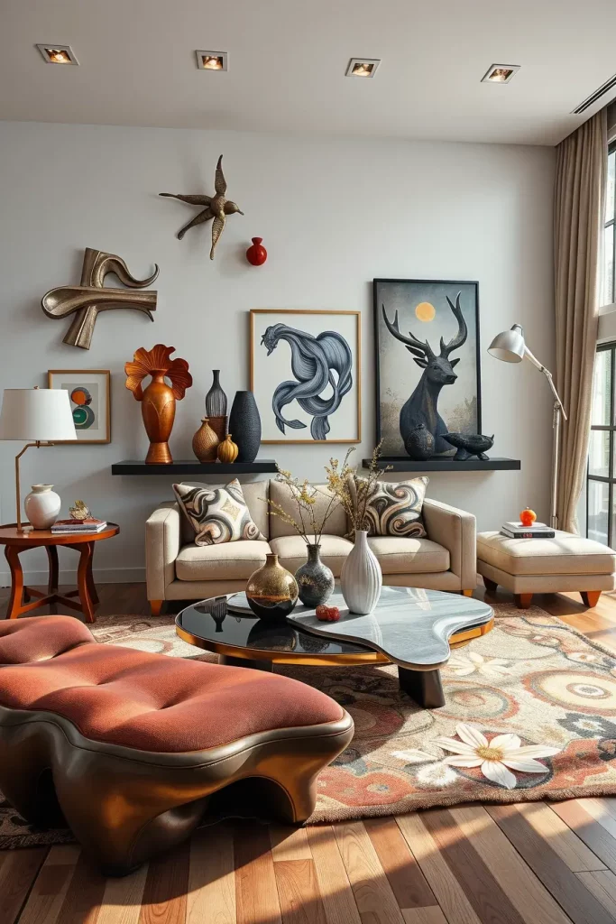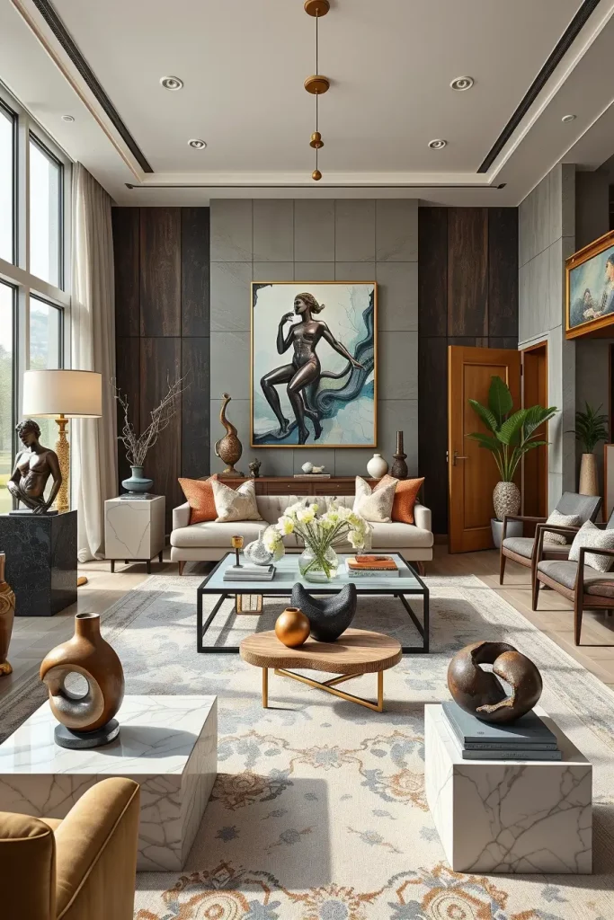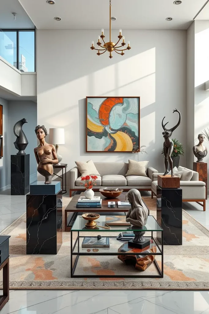 One of the ways to transform a modern living room into a gallery-like environment would be to add surrealist sculptures to the room. The sculptures are not mere decorations but are rather conversation pieces that alter the ambiance of the room. They can be based on organic shapes, abstract shapes or imaginary figures.