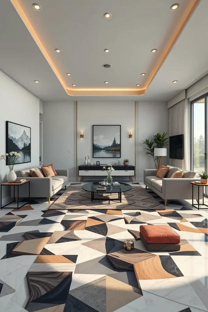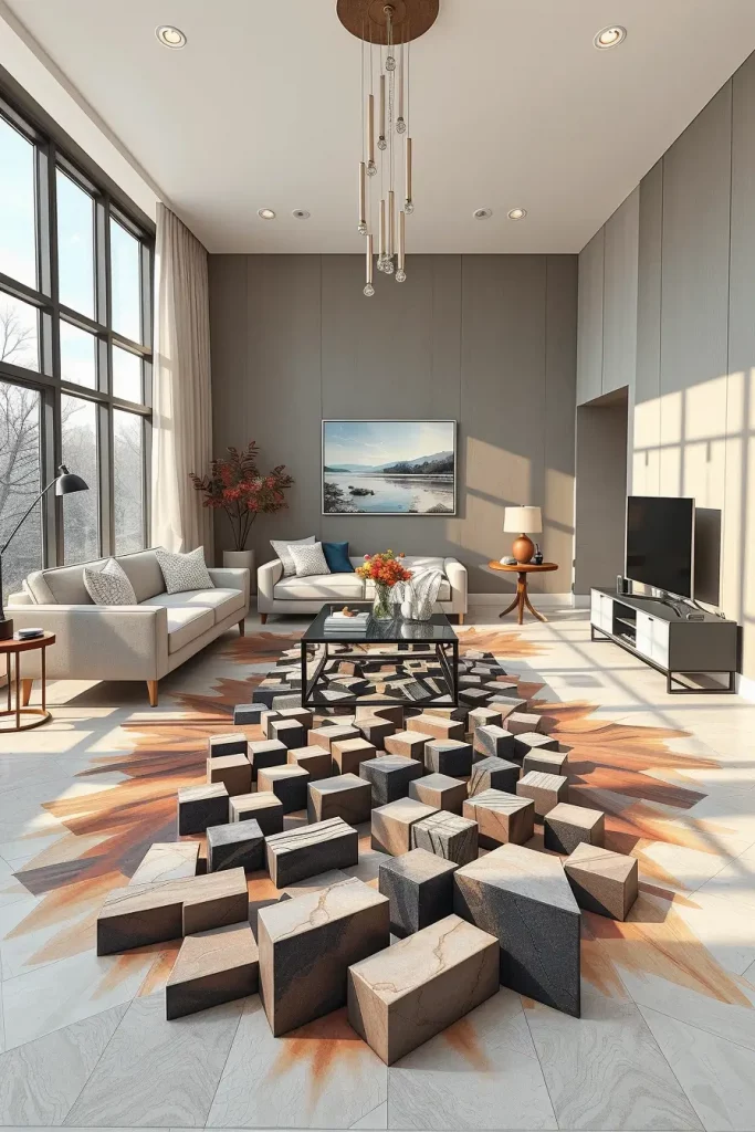 I like geometric illusions on rugs, spirals, 3D cubes, or distorted grids that make the floor move under your feet. The combination of these with sleek, neutral furniture will make the flooring the surreal centerpiece. In bigger living rooms, it can be extended with flooring with artistic patterns that can be surrealistic.