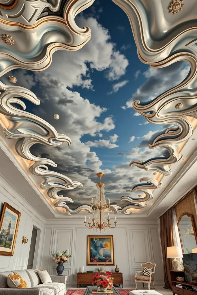 In designing ceilings, I prefer to design suspended sculptural lights or layered panels to form a wave effect. The painted murals that resemble surreal skies or dreamlike scenes are also very impressive. Reflective ceilings with metallic or glass like finishes enhance the feeling of space.