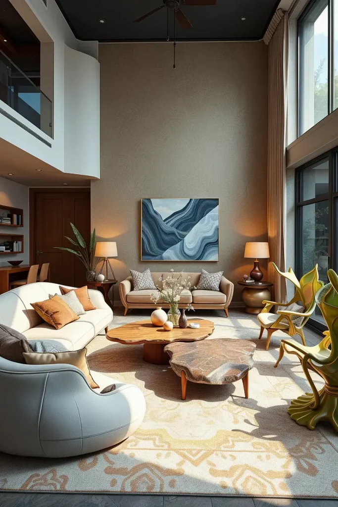 In my own design work, I tend to recommend beginning with a focal point such as an eye-catching curved sofa covered in velvet or leather. The surrealist aesthetic is further enhanced by the surrounding of the side tables that are melted or asymmetrical in shape. Other furniture like the wave-shaped shelves or oval rugs give the room more depth. All these items not only add to the visual equilibrium of the room but also to its functionality, so that the interior is not only imaginative but also livable.