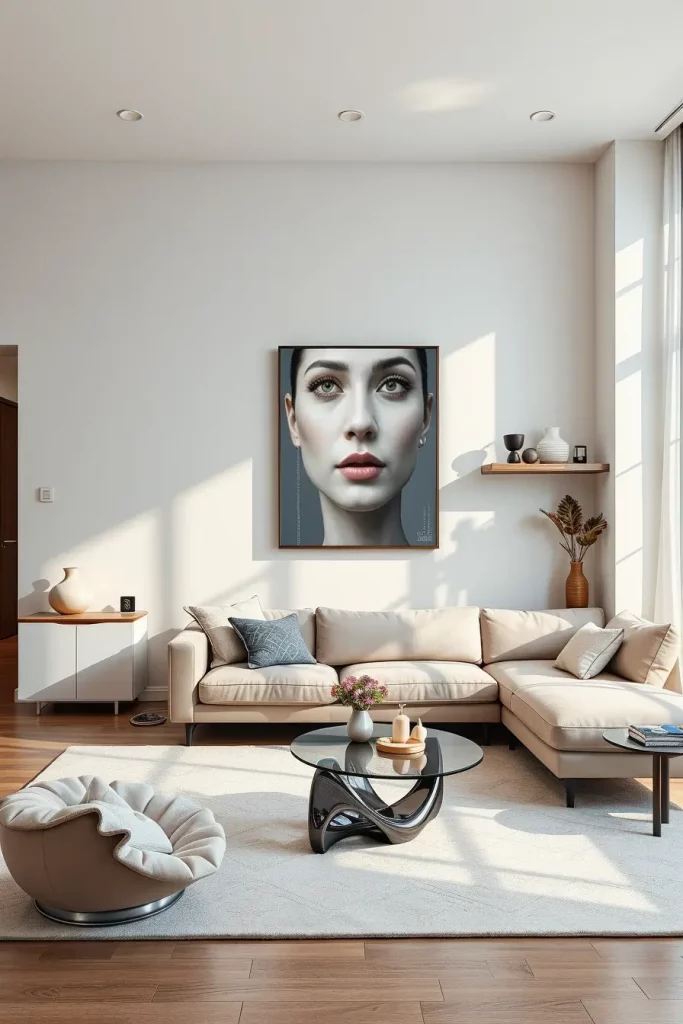 When I begin to design a modern living room with surrealist influences, the first aspect I take into consideration is the balance. Functionality is important since the room must be able to meet everyday needs, but imagination is the aspect that brings about curiosity. In my case, I would put classic sofas and storage furniture with surprising sculptural elements that will add a feeling of surprise to the room. The neutral background enables the surrealist elements to be prominent without the room being overpowering.