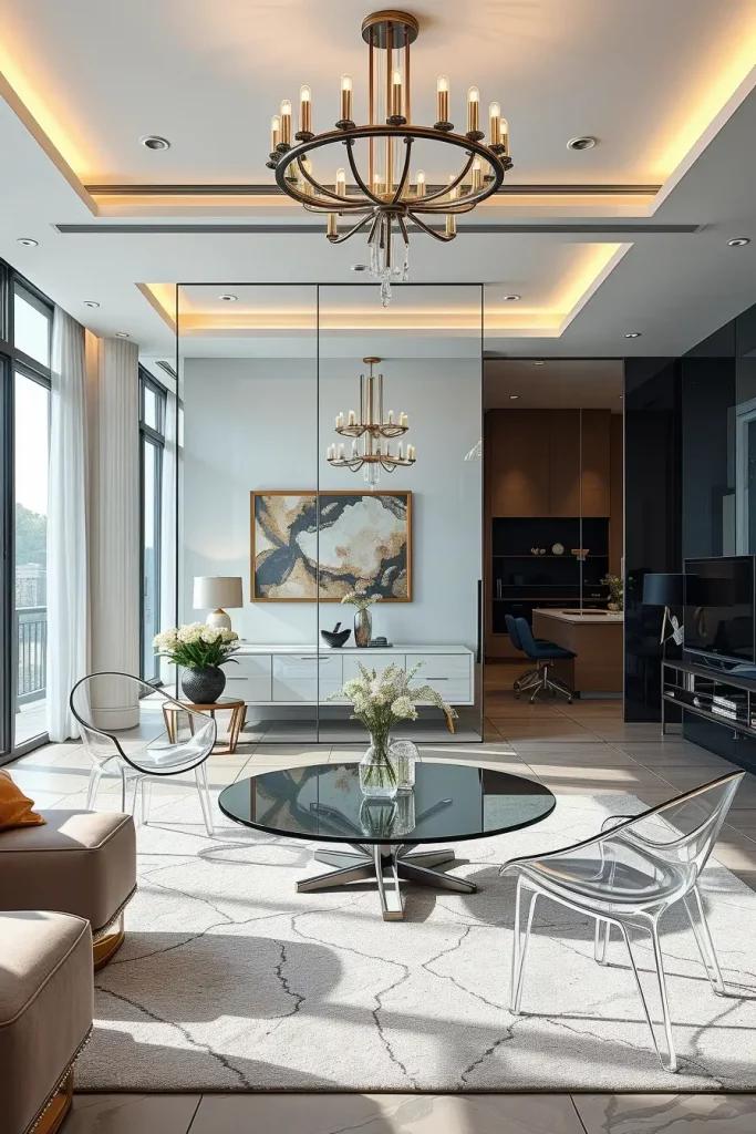 I prefer glass coffee tables of strange shapes, acrylic chairs, or transparent partitions that can show layered rooms behind them. Mirrors can also be used as a surrealist device, multiplying views and distorting the viewer of space.