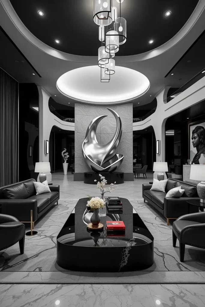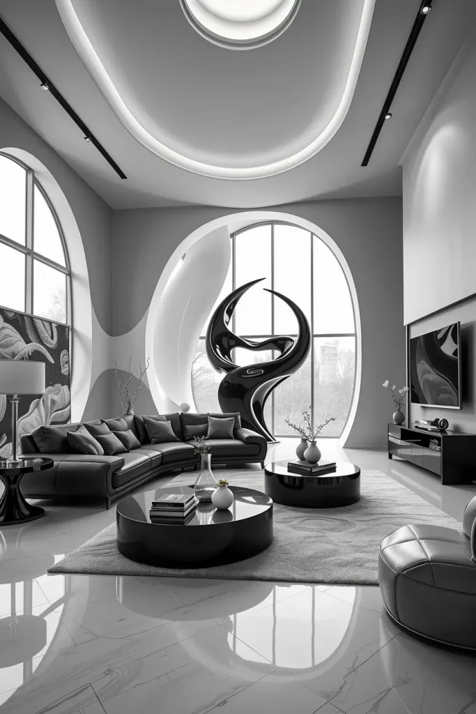 I would add minimalist monochrome furniture, such as black leather sofas or white lacquered tables, and then surprise with something surreal, such as curved walls, furniture in the shape of clouds or oversized sculptures. The black and white color scheme enhances the surrealist mood since there is no other color to distract the viewer.