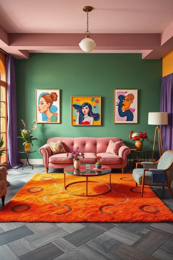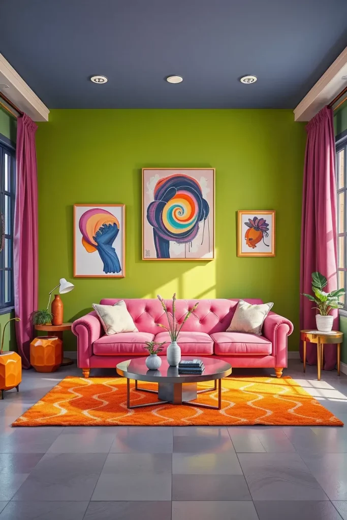 Whereas monochrome adds drama, surrealist living rooms can also flourish on the bold color contradictions. I prefer combining colors that do not normally go together, like pink and green or orange and purple. This produces a deliberately disorienting, but fun effect.
