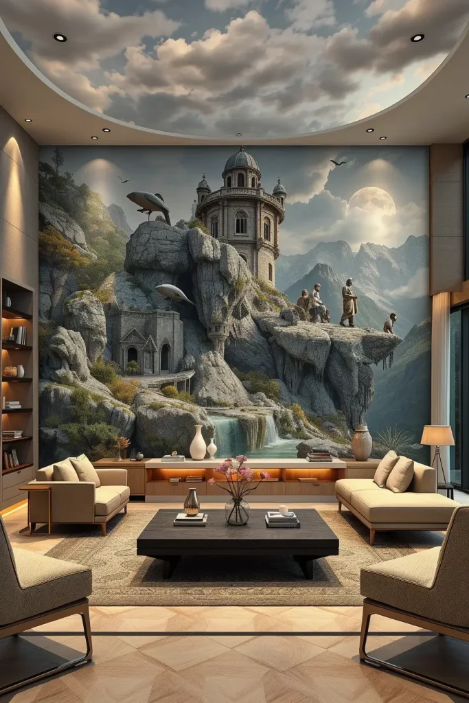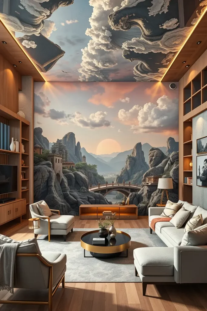 I would combine a large-scale mural with minimal furniture so that the artwork takes centre stage. Murals might include surrealistic landscapes, distorted buildings or organic shapes. To prevent the room from being overcrowded, I prefer to counterbalance such walls with a few shelves and simple seats.