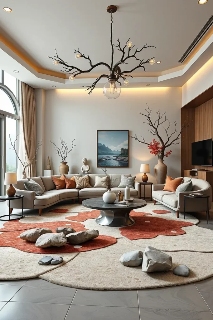 I prefer to add furniture items like curvy sofas, wave-like coffee tables and rugs that look like stones or leaves. The use of lighting fixtures in the form of tree branches or shells creates even more surreal beauty. These pieces do not only have their functional purpose but also add a sense of fluidity to the room.