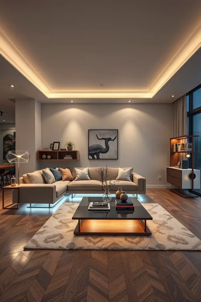 I would suggest the addition of layered lighting behind glass or acrylic features, which will further create the surreal effect of floating, glowing objects in the living room.