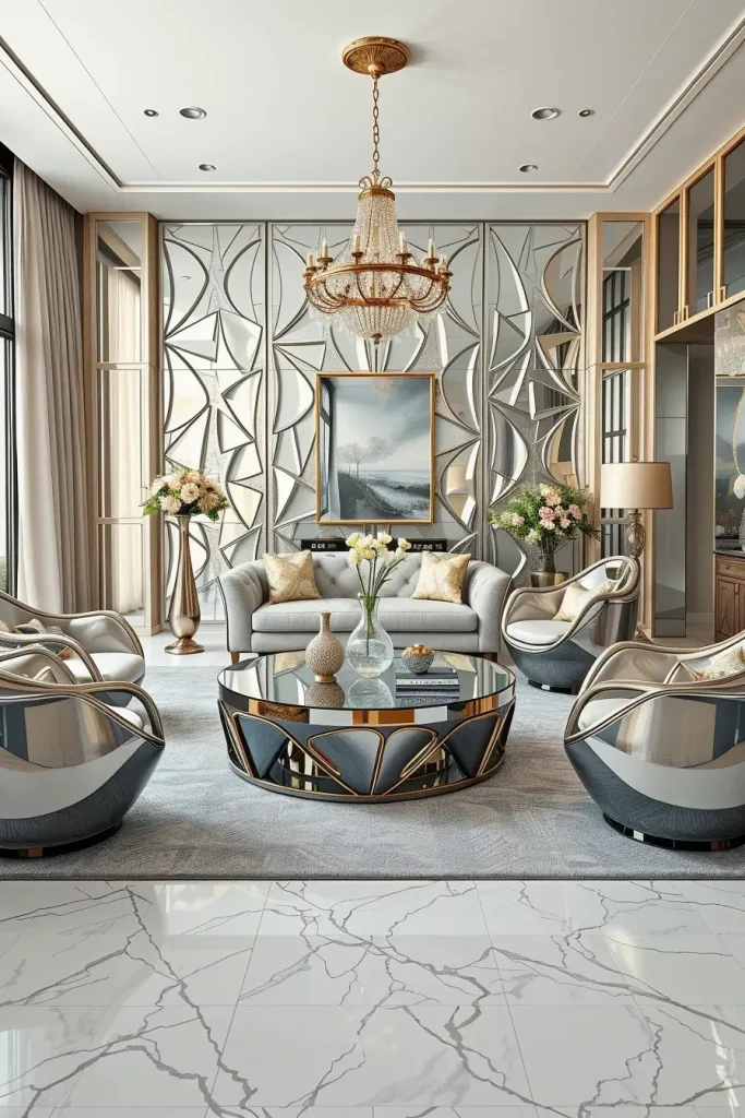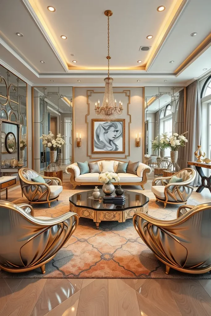 I prefer to mix metallic coffee tables, sculptural chairs with chrome finishes, and even metallic wall panels. Gold, silver or mirrored details reflect light and make the living room seem bigger, but still surreal and modern.
