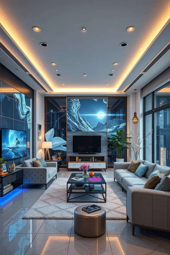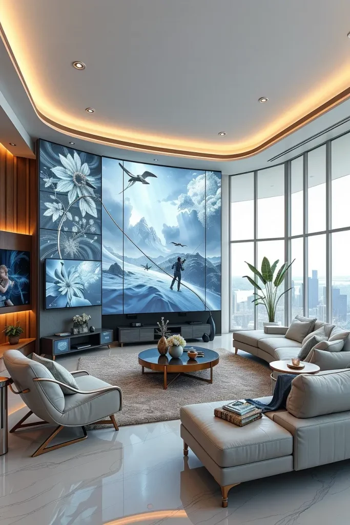 I would add concealed projectors with dreamy images projected onto walls, or intelligent glass walls that change in opacity to create different moods. Even curved screens that can be integrated into organic furniture forms can combine utility with surreal beauty.