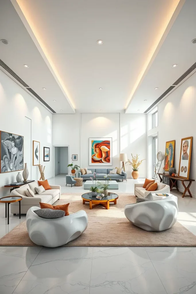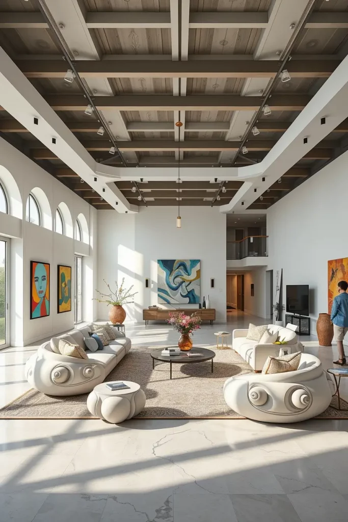 I prefer white walls as backgrounds, sculptural seating and statement art pieces. Furniture can also be functional art- curvy sofas, abstract tables, or chairs that are more like sculptures than furniture.