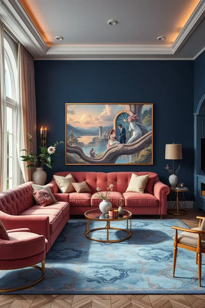 In surrealist living rooms, color is a crucial element, because it contributes to the dreamlike atmosphere that characterizes the style. Compared to the strictly neutral contemporary interiors, surrealism is more likely to rely on unlikely combinations, such as soft pastels and deep jewel tones, or muted grays with sudden neon accents. I have discovered that this contrast brings out a visual conflict that is interesting and communicative.