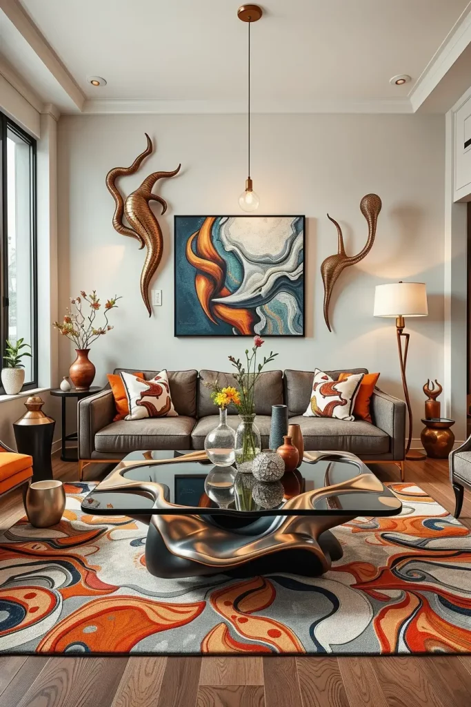 I tend to suggest some strange things like wall-mounted sculptures, which create shadows and play with light, or coffee tables that resemble liquid metal that is frozen in the middle of its movement. Even minor details such as throw pillows with surrealist prints, unusual vases or artistic rugs can change the room entirely. All of these details give a lot of personal touches, which make the living room not only stylish, but also unique.
