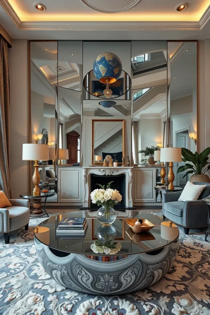 In my design opinion, I would suggest using a large and distorted mirror above a sofa or console table and small reflective accessories in the rest of the room. Even coffee tables made of glass or lampshades made of mirrors can add to the illusion effect The room is all of a sudden multi-dimensional.