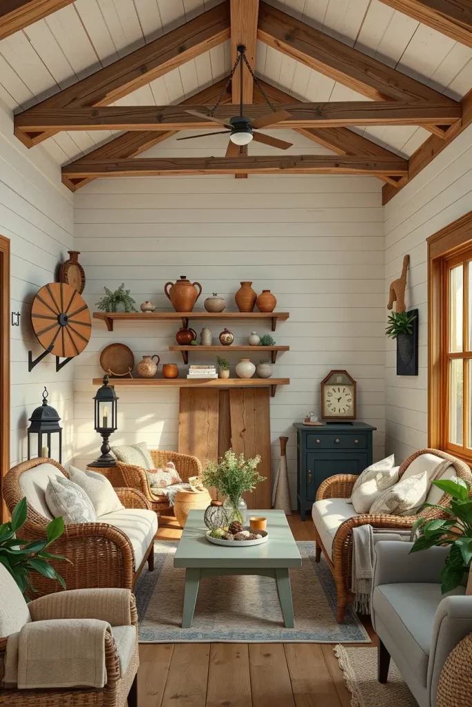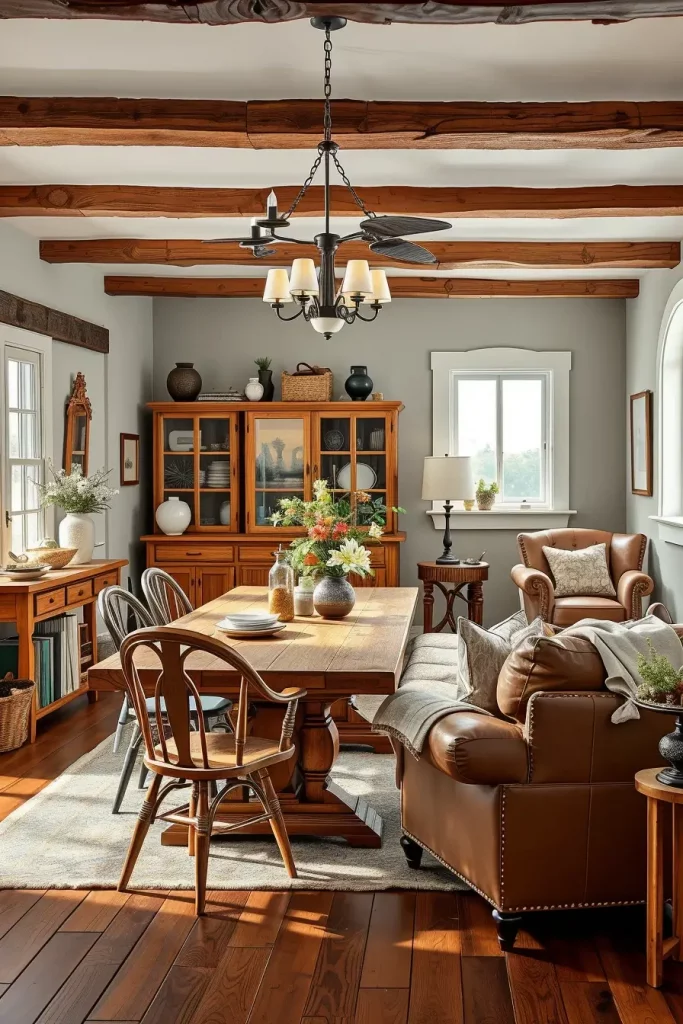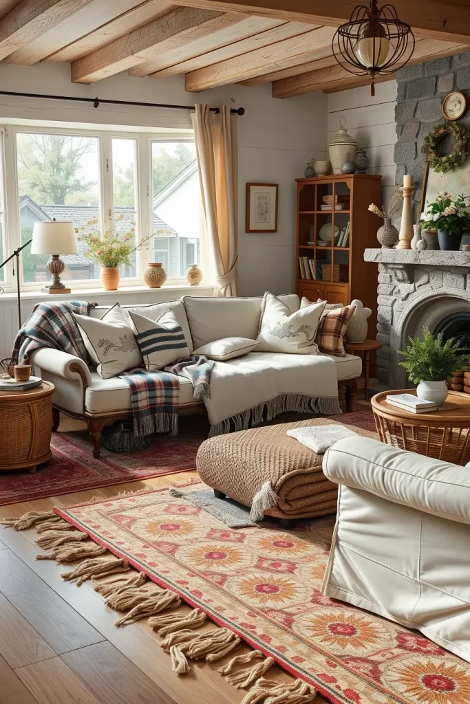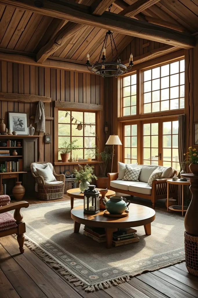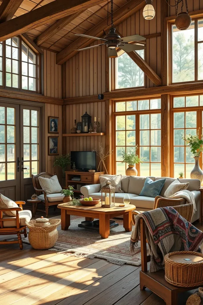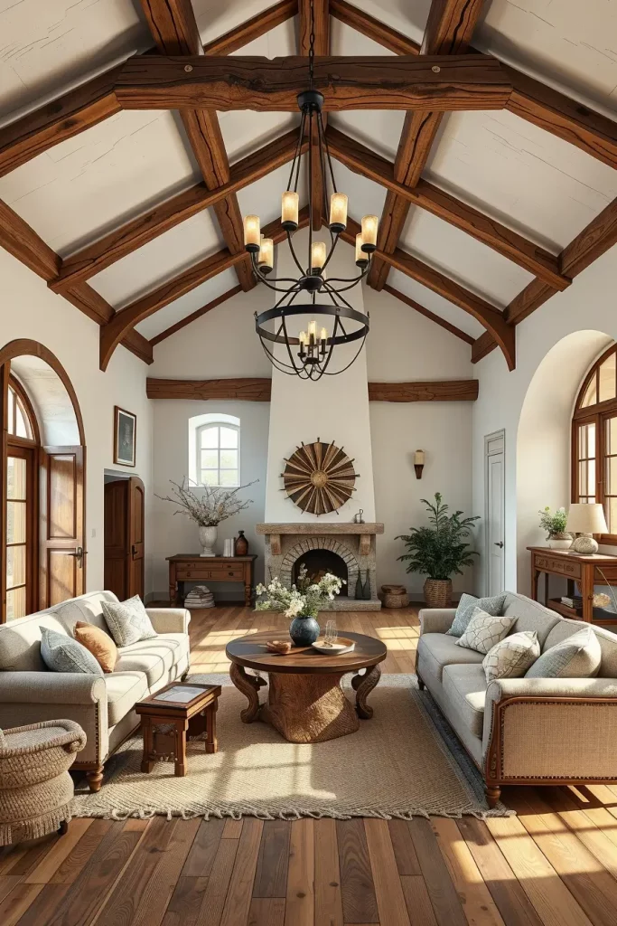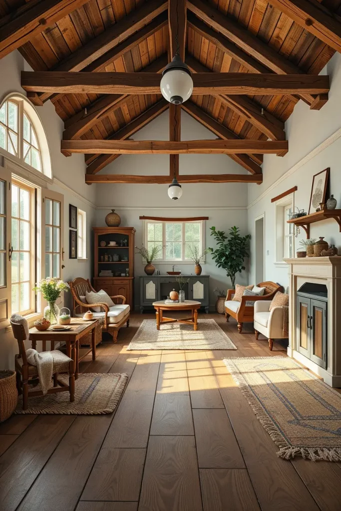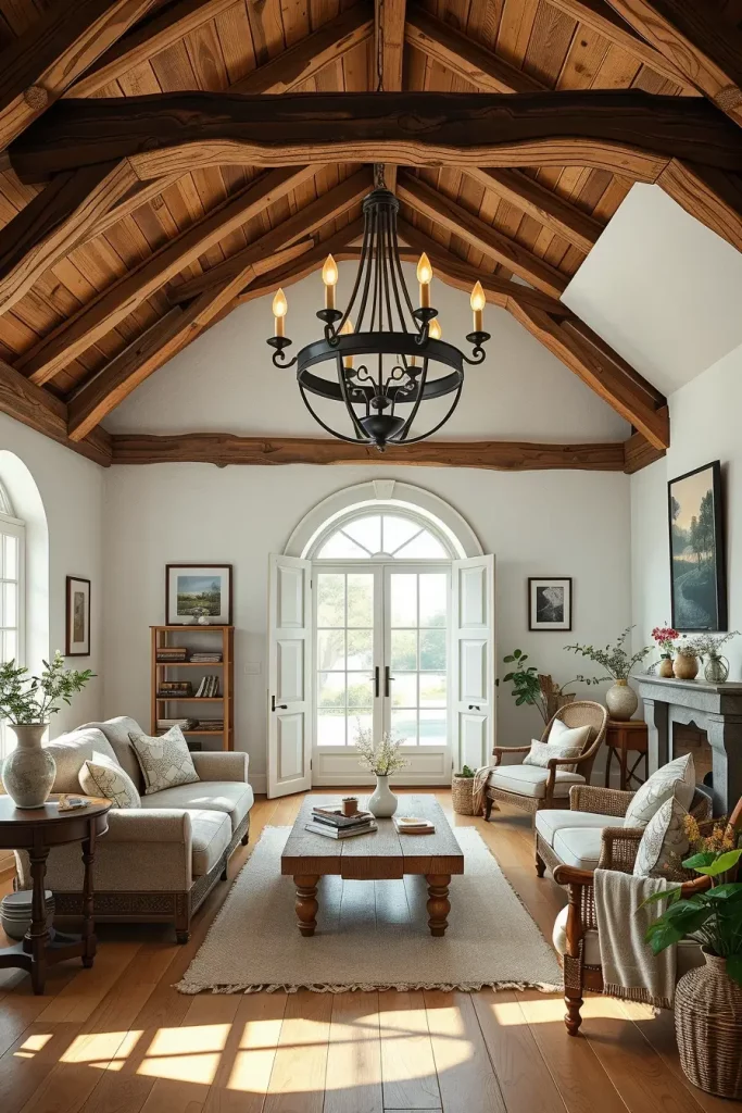 Furniture tends to be plain yet practical- imagine sturdy wooden tables, woven baskets and handmade chairs. The area may be completed with the decorative items such as old lanterns, pottery, and fresh flowers. These little details make each corner look curated but not at the expense of the casual, homey feel.