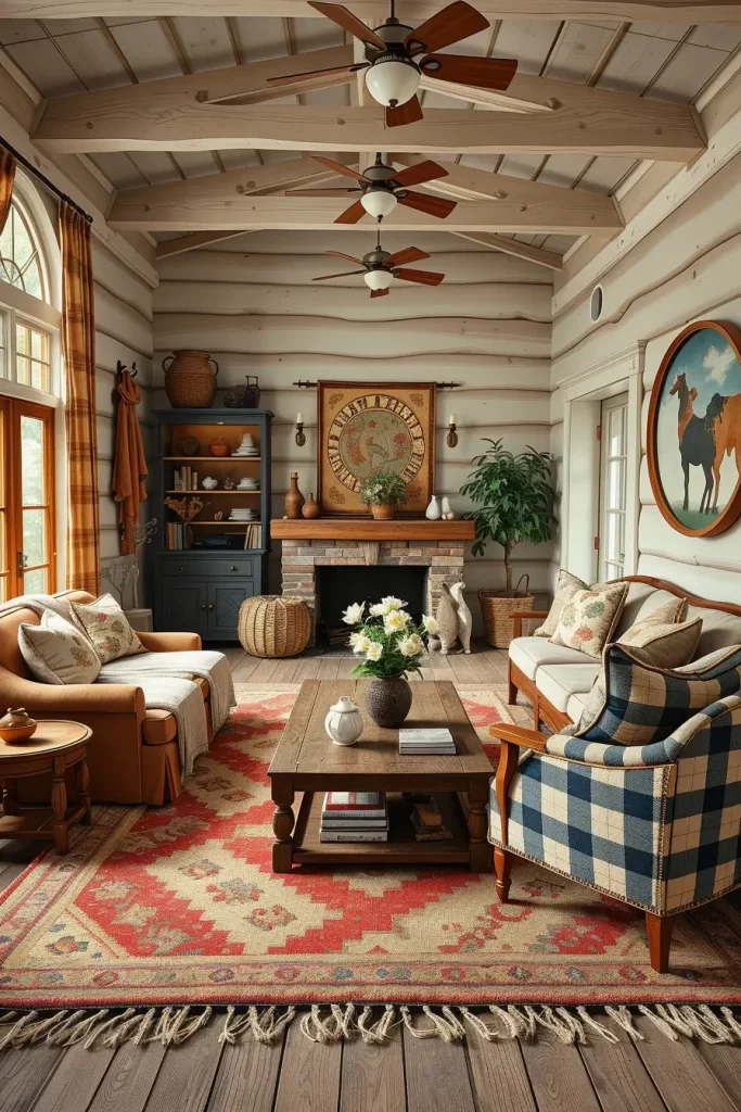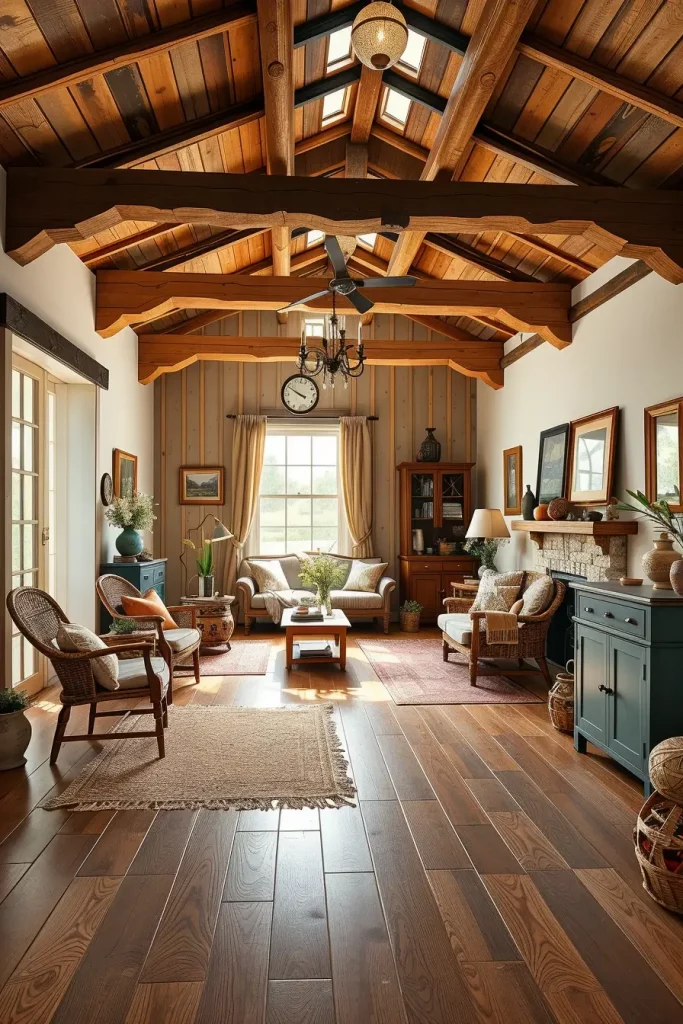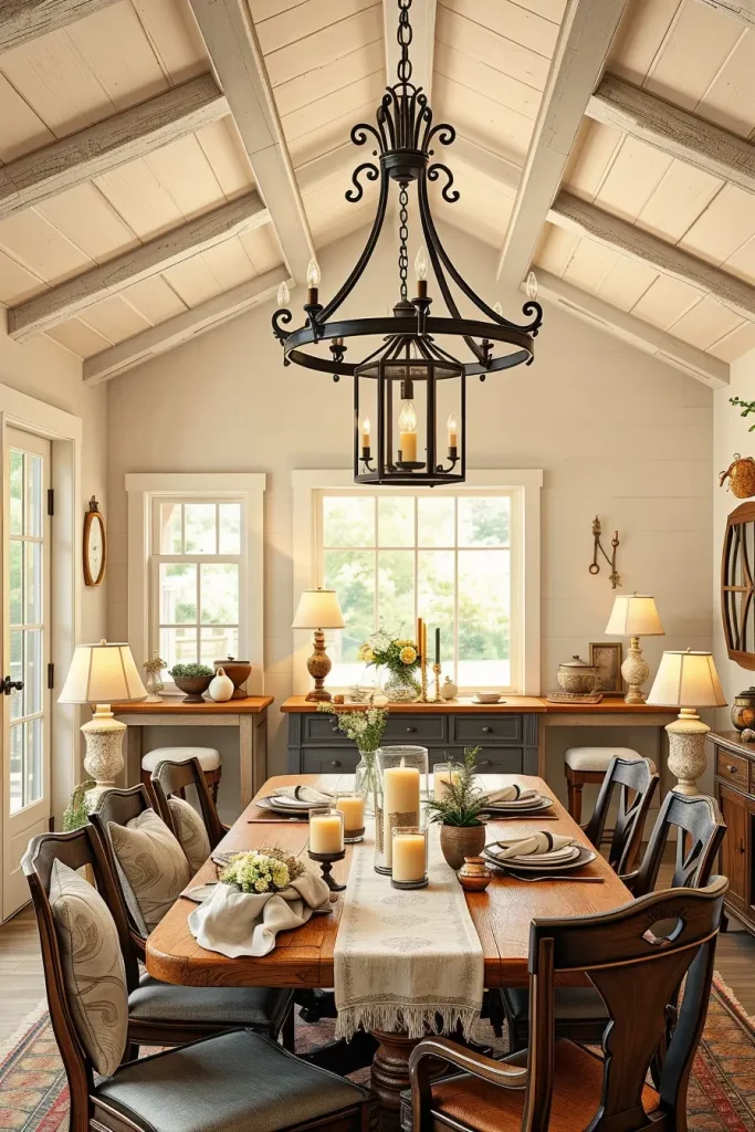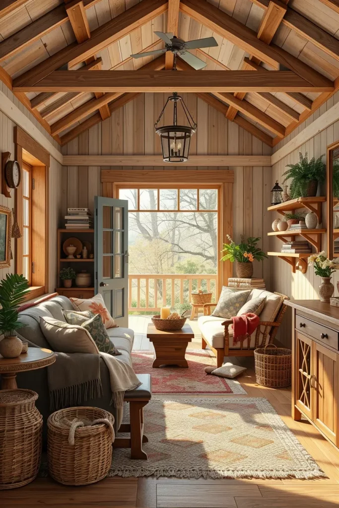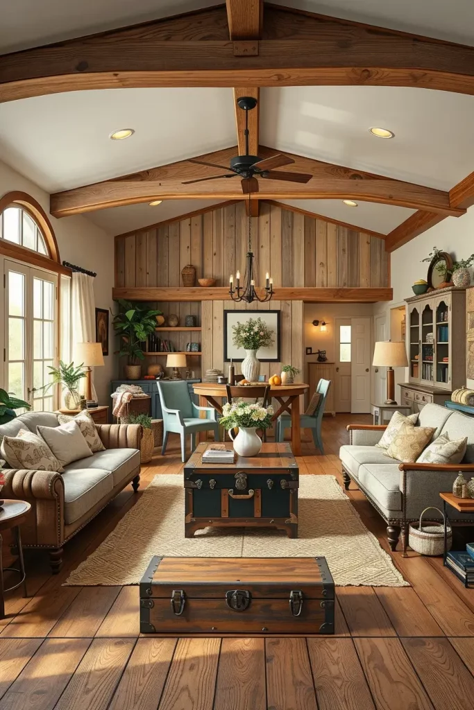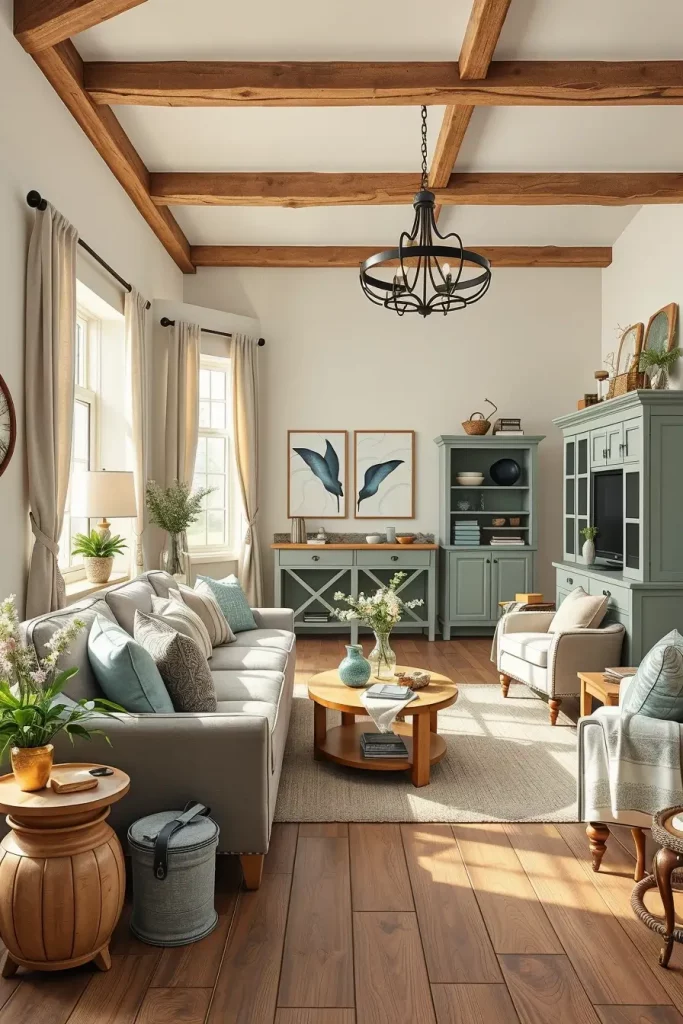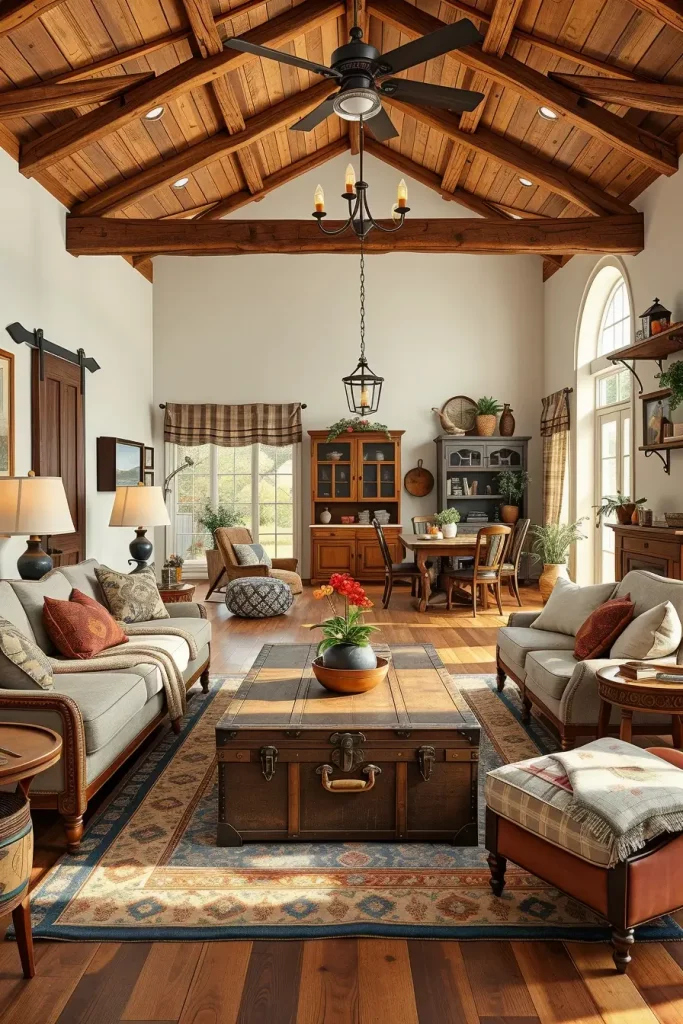 Furniture tends to be plain yet practical- imagine sturdy wooden tables, woven baskets and handmade chairs. The area may be completed with the decorative items such as old lanterns, pottery, and fresh flowers. These little details make each corner look curated but not at the expense of the casual, homey feel.