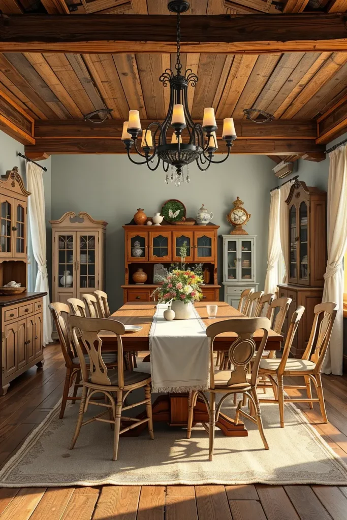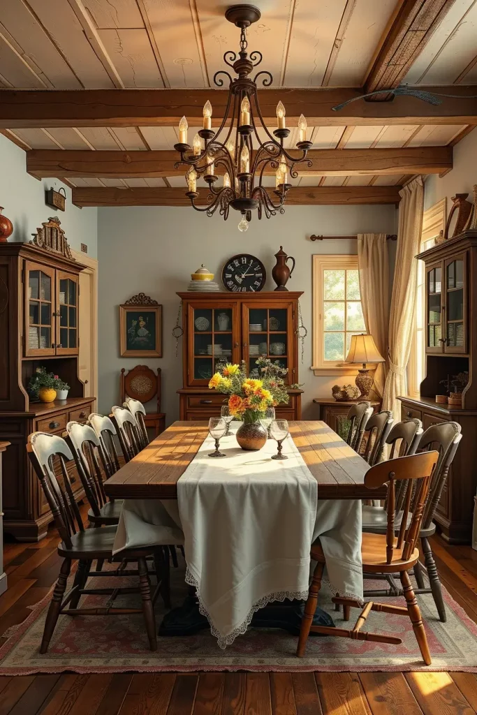 The furniture item must appear to have been gathered. Dishware can be stored in wooden hutches, old cabinets and sideboards, which also give character. The space is welcoming with soft textiles: linen tablecloths and cotton runners.