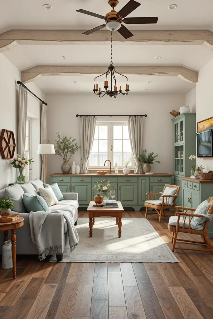 Practically, I tend to mix whitewashed walls with wooden decorations and dull textiles. Having some accents of sage green on the cabinets or pale yellow on accessories brings in a vibrant yet modest character. The balance between modern and cozy is achieved by wooden floors that are combined with linen curtains in light colors.