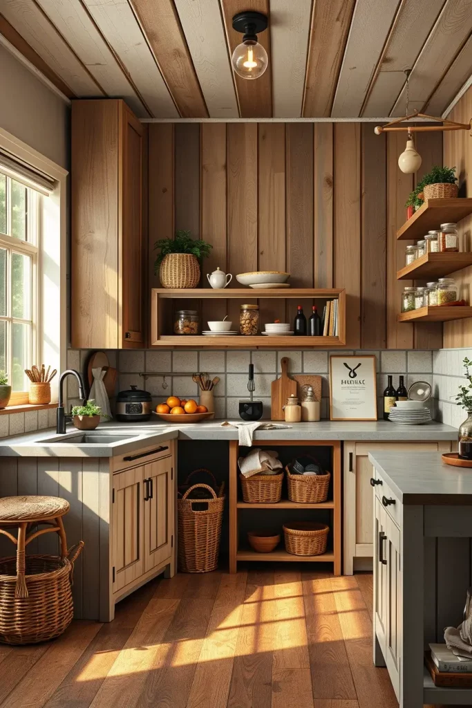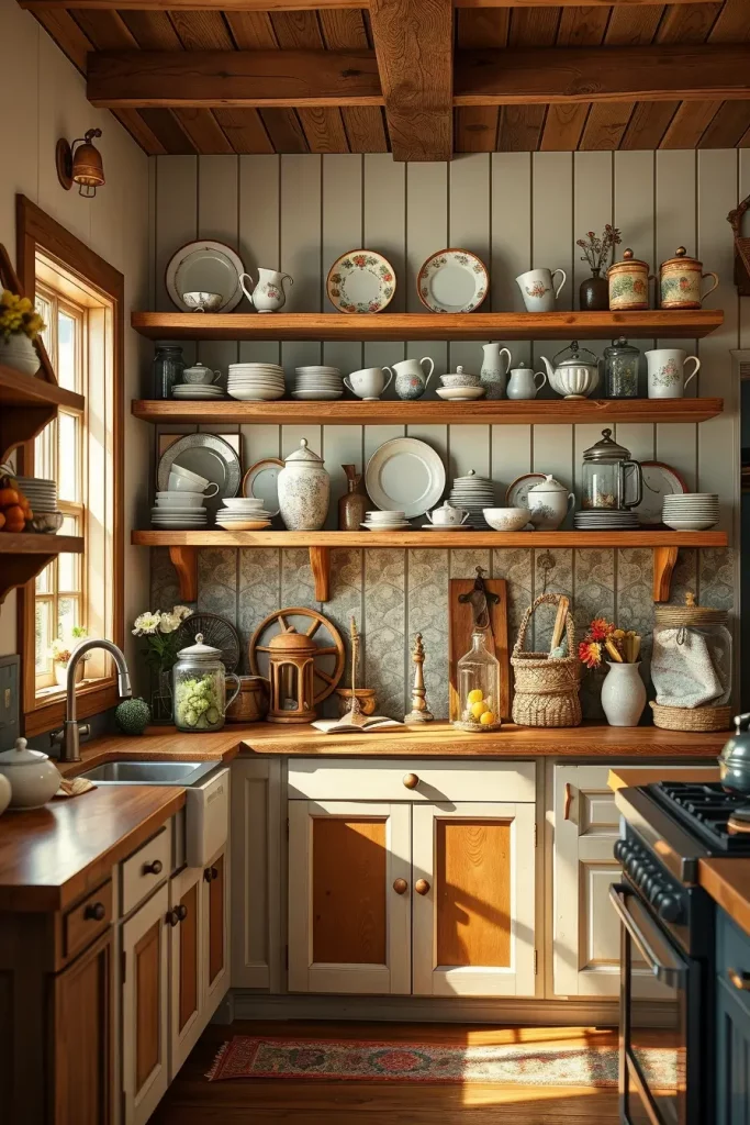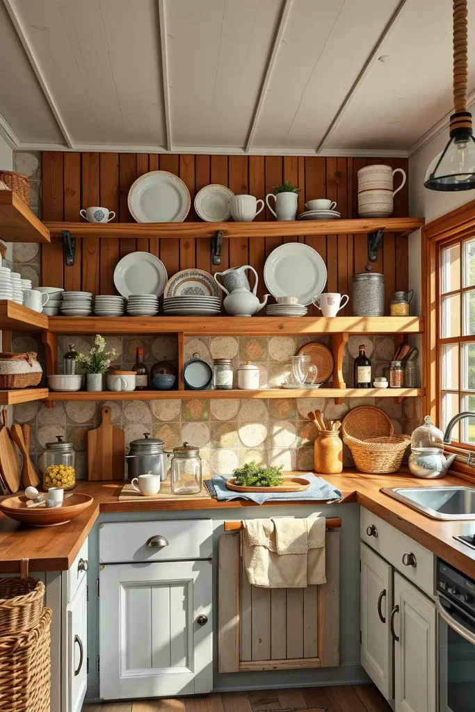 I would suggest wooden shelves with exposed brackets because they will fit perfectly in rustic cabinets. The vintage plates, ceramic mugs, and woven baskets are styled to give them a timeless look. Combining vintage and modern items makes the shelves look selective but functional.