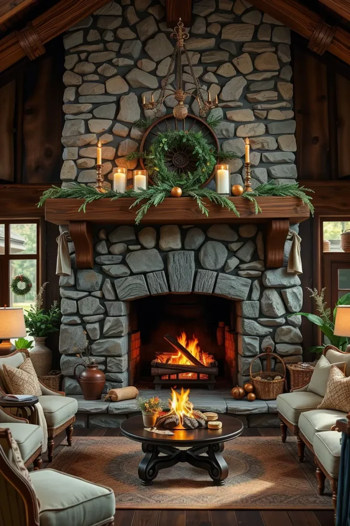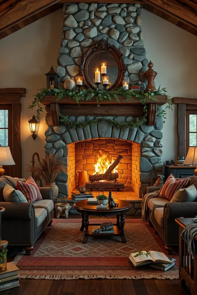 The surround of the fireplace may be natural stone, painted brick or wood. A rustic wooden mantel can be ideal to place candles, lanterns or seasonal greenery. The fireplace is functional and social as it has comfortable seats around it.