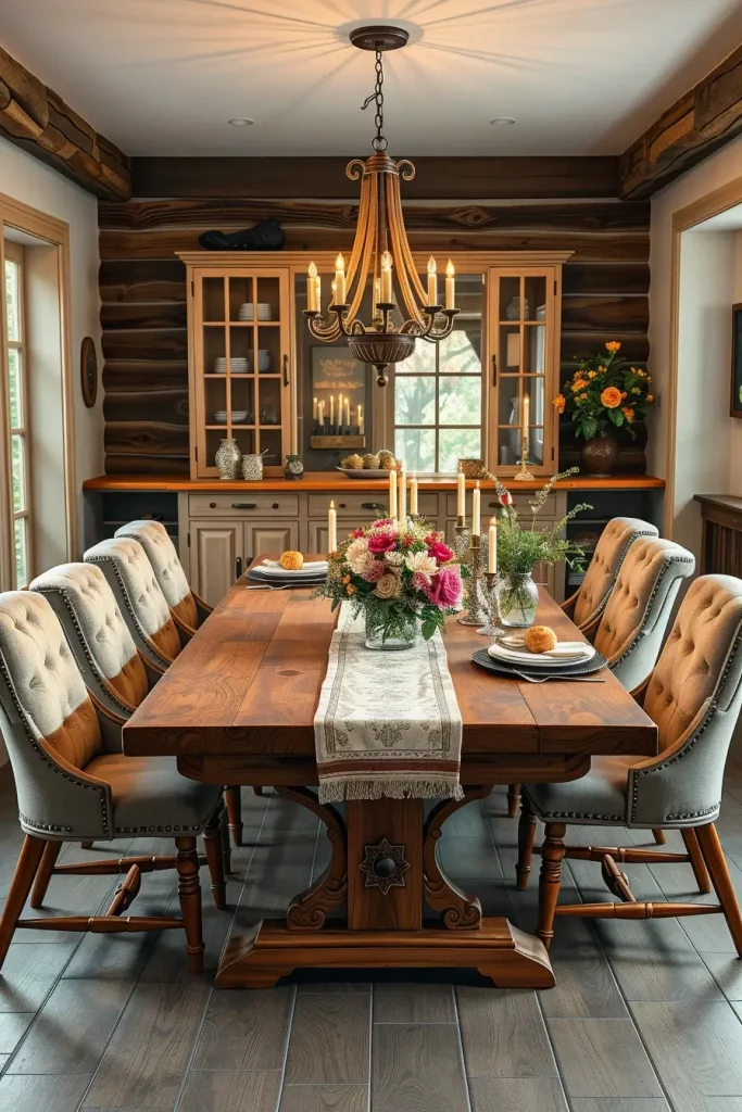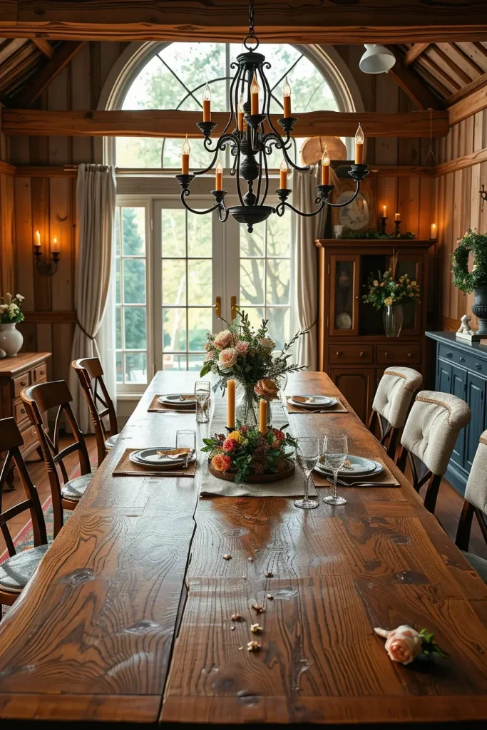I like farmhouse tables that have a grain that you can see and are a little bit weathered. They are accompanied by wooden or upholstered chairs, which makes the atmosphere warm. The table can be finished off with a linen runner, candles, or fresh flowers but not too formal.