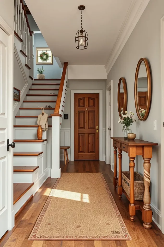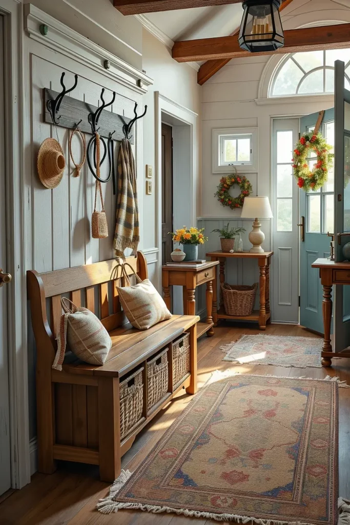 In the case of furniture, I prefer wooden benches with storage, wicker baskets to keep shoes and antique hooks to keep coats and hats. A small console table with a rustic lamp will add a soft glow that is ideal in the evenings.