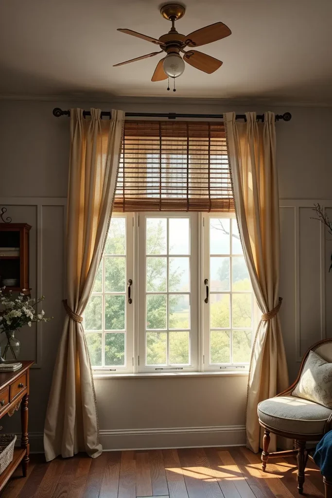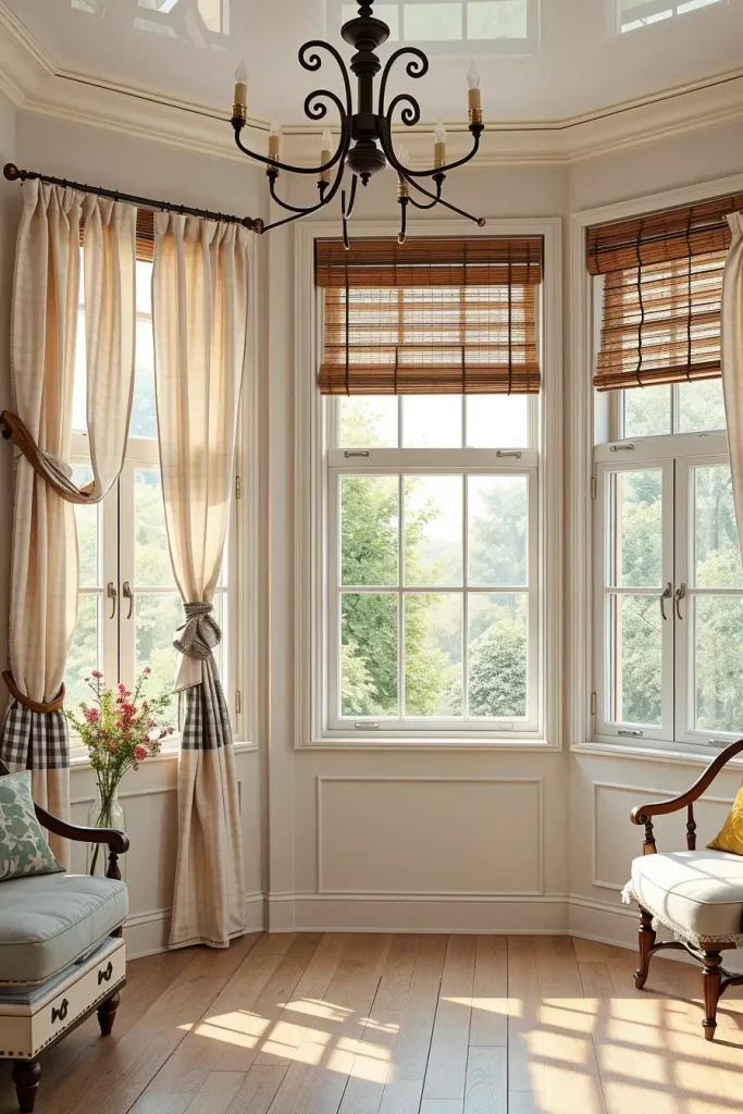 To be practical, I would suggest light materials which are easily washed and taken care of. Wooden blinds or Roman shades in natural colors are also a great choice that would not break the style of the rustic style. The design can be completed by a wrought iron curtain rod.