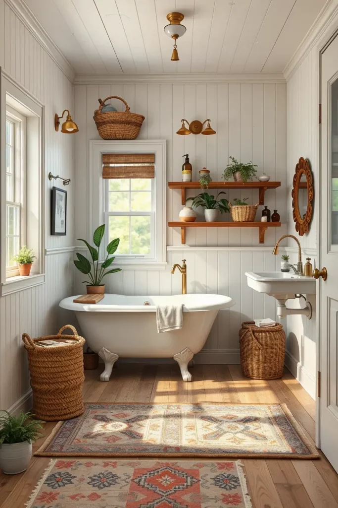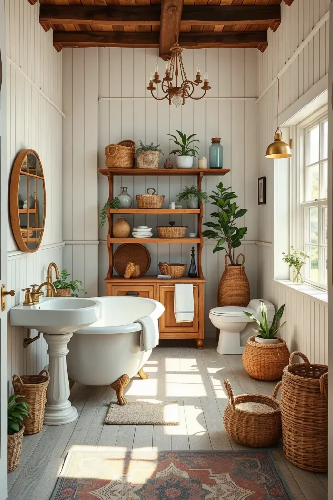 I tend to add wood accents, such as shelving or framed mirrors to help counteract the coldness of tile and porcelain. Walls are covered with beadboard painted in light colors like sage green or cream that add texture and preserve the cottage feel. The look can be completed with a woven basket to hold towels and a patterned rug.
