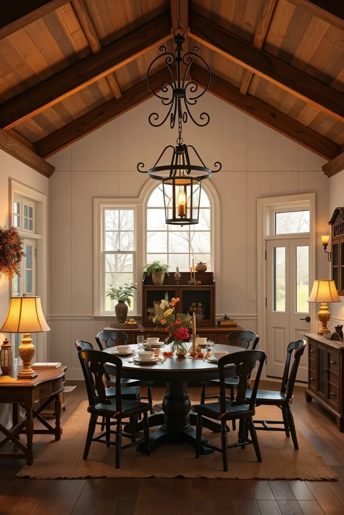 The mood of a farm cottage is created with the help of lighting. I tend to choose farmhouse chandeliers made of wrought iron or distressed wood, which take the central place in the living or dining room. When combined with vintage-style bulbs, they are instantly charming.