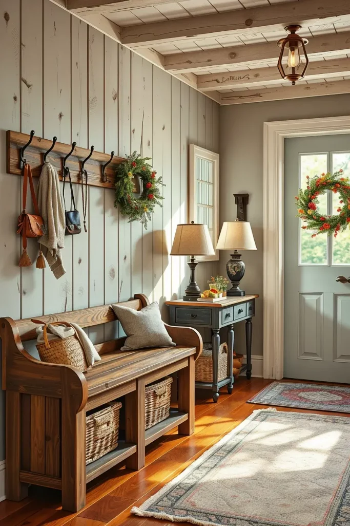 There should be very little furniture here–just a small console table with a vase of flowers or a basket to store things. Wrought iron or wooden coat hooks maintain the rustic appearance but functional. A mirror on the wall provides light and functionality.