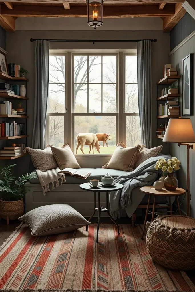 A reading nook is one of the most comfortable places in a farm cottage. I prefer to put these by a window where they have the light of nature, on either a built-in bench or a comfortable armchair. Earthy cushions and throws add more comfort to the room.