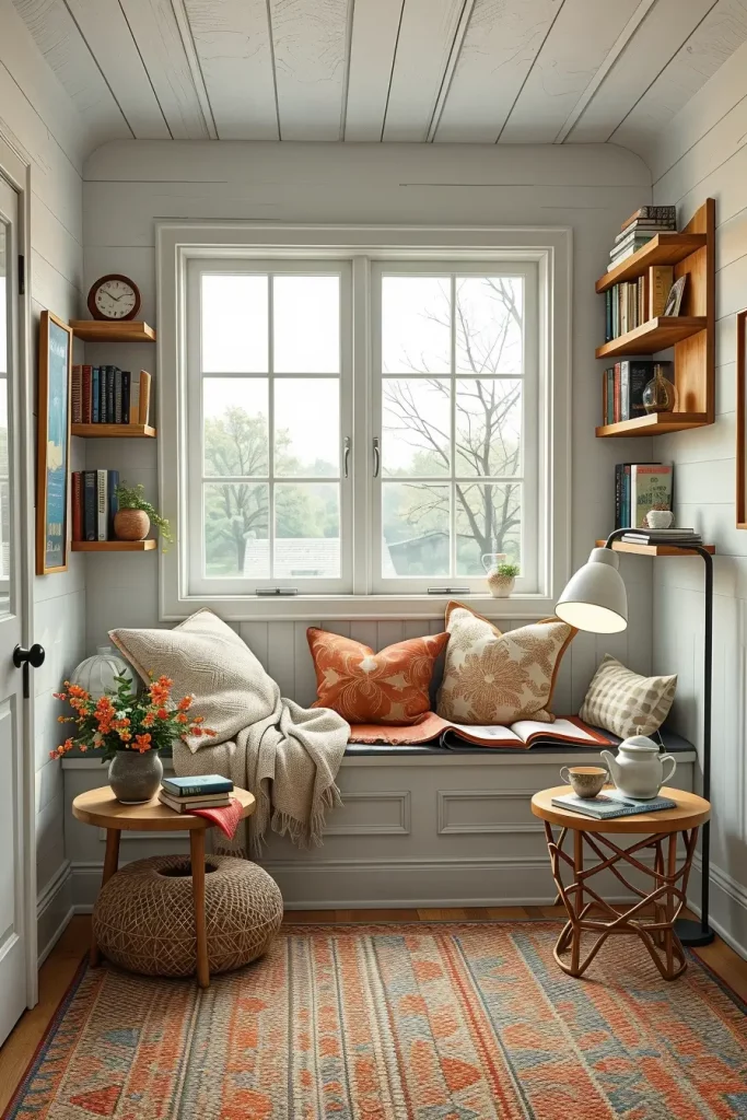 To be functional, I usually add bookshelves or floating shelves so that reading materials are within reach. The setting is completed by a small side table to hold a cup of tea and a floor lamp with a warm bulb. Such a nook is both comfortable and functional.
