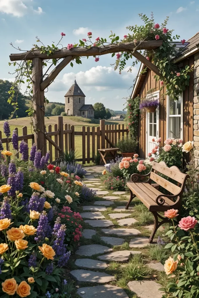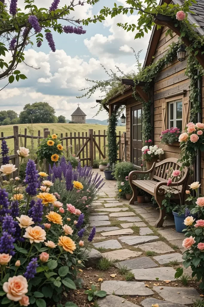 I tend to add herb and vegetable raised beds and flower borders of lavender, daisies, and roses. A wooden bench or a wrought iron seating is functional and makes the garden a place to relax. Vertical interest is created by arbors with climbing roses or ivy and they also frame the entrance attractively.