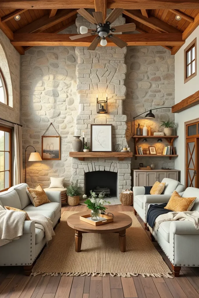 One of my favorite things to add rustic appeal to farm cottage interiors is stone walls. They bring texture and strength and natural beauty to living rooms, kitchens or even hallways. The first thing that comes to mind is a stone wall that instantly transforms into the center of the area and does not lose the authenticity of the cottage.