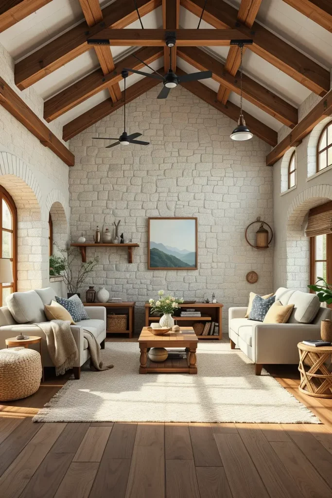 Practically, my favorite combination is stone walls with warm wooden beams and light-colored furniture. The coarse surface of stone is offset by the addition of soft materials such as wool throws and linen cushions. In case of kitchens, wooden shelves that are open against a stone background are simply beautiful and they bring out the functionality and style.