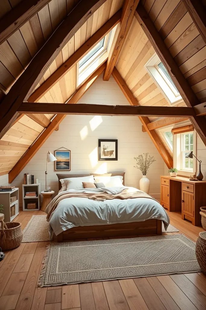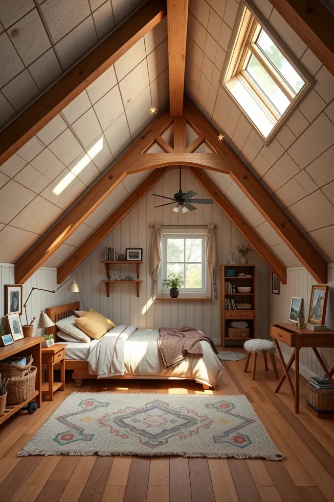 In the case of furniture, I tend to add low profile beds, eaves storage, and small desks. The comfort of the space is completed by adding a soft rug, lightweight curtains and warm bedding. Skylights are particularly useful in attics, which allows daylight in and makes the room more spacious.