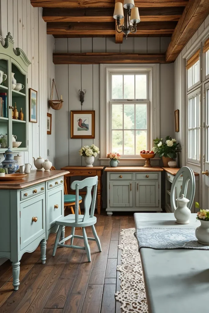 Farm cottages live on painted furniture that is weathered but solid. I adore using items in more subdued colors such as sage green, cream, or pale blue that are distressed. These items are personal and bring out the history of the cottage and yet they are functional.
